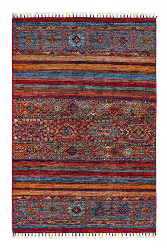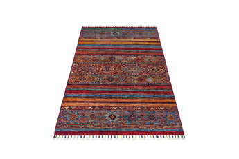 Khorjin rugs from Afghanistan are a type of traditional textile often used as bags or saddlebags by nomadic tribes in the region. These rugs are known for their practical uses and beautiful patterns. Originally created to be used as pack bags by nomadic people, Khorjin rugs are often designed with functionality in mind. The patterns on Khorjin rugs are often geometric and colorful, with symbolic motifs representing the tribe's culture and traditions. Common motifs include diamonds, rhombuses, and other geometric shapes, often in a rich color palette. Khorjin rugs are typically woven from wool, which makes them durable and tough enough for nomadic life. The colors in Khorjin rugs are usually natural, produced from plant dyes, giving them a warm and earthy color palette. Typical colors include red, blue, brown, and beige, but there may also be touches of green and yellow. Khorjin rugs are not just practical, but they are also artworks that tell stories about the tribe's life and culture. Each rug is unique and reflects the weaver's skill and creativity. High-quality materials and craftsmanship make Khorjin rugs long-lasting and valuable investments for customers.