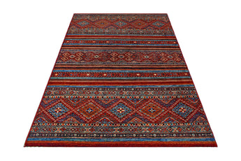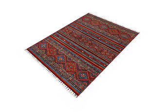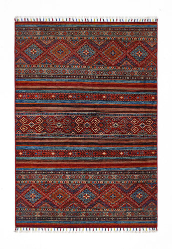 Khorjin rugs from Afghanistan are a type of traditional textile often used as bags or saddlebags by nomadic tribes in the region. These rugs are known for their practical uses and beautiful patterns. Originally created to be used as pack bags by nomadic people, Khorjin rugs are often designed with functionality in mind. The patterns on Khorjin rugs are often geometric and colorful, with symbolic motifs representing the tribe's culture and traditions. Common motifs include diamonds, rhombuses, and other geometric shapes, often in a rich color palette. Khorjin rugs are typically woven from wool, which makes them durable and tough enough for nomadic life. The colors in Khorjin rugs are usually natural, produced from plant dyes, giving them a warm and earthy color palette. Typical colors include red, blue, brown, and beige, but there may also be touches of green and yellow. Khorjin rugs are not just practical, but they are also artworks that tell stories about the tribe's life and culture. Each rug is unique and reflects the weaver's skill and creativity. High-quality materials and craftsmanship make Khorjin rugs long-lasting and valuable investments for customers.