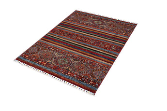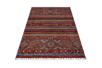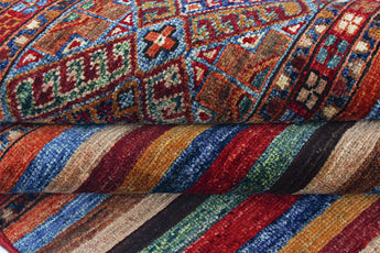 Khorjin rugs from Afghanistan are a type of traditional textile often used as bags or saddlebags by nomadic tribes in the region. These rugs are known for their practical uses and beautiful patterns. Originally created to be used as pack bags by nomadic people, Khorjin rugs are often designed with functionality in mind. The patterns on Khorjin rugs are often geometric and colorful, with symbolic motifs representing the tribe's culture and traditions. Common motifs include diamonds, rhombuses, and other geometric shapes, often in a rich color palette. Khorjin rugs are typically woven from wool, which makes them durable and tough enough for nomadic life. The colors in Khorjin rugs are usually natural, produced from plant dyes, giving them a warm and earthy color palette. Typical colors include red, blue, brown, and beige, but there may also be touches of green and yellow. Khorjin rugs are not just practical, but they are also artworks that tell stories about the tribe's life and culture. Each rug is unique and reflects the weaver's skill and creativity. High-quality materials and craftsmanship make Khorjin rugs long-lasting and valuable investments for customers.