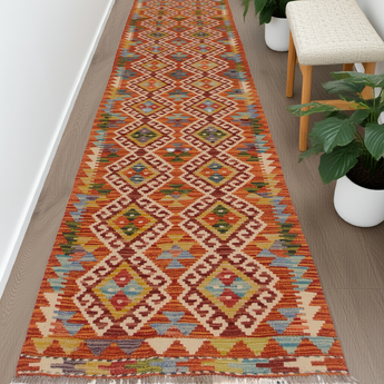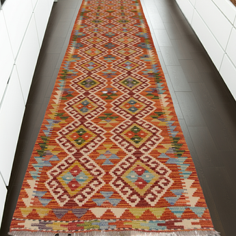 A Masterpiece of Afghan Craftsmanship with Caucasian Inspiration. Kelim Chobi rugs are a brilliant example of traditional Afghan craftsmanship, combining both quality and aesthetic finesse. These rugs are uniquely handwoven in Afghanistan and carry a rich history of craftsmanship, where traditional techniques have been passed down through generations. What makes Kelim Chobi rugs particularly remarkable is their distinct design, heavily influenced by Caucasian patterns. The geometric shapes and symmetrical patterns, typical of Caucasian rugs, give Kelim Chobi rugs their unique and timeless character. The colors used in Kelim Chobi rugs are often subdued and natural, providing them with an elegant and sophisticated look. These colors are derived from natural dyes, which not only provide a durable and authentic color palette but also reflect a deep respect for nature and traditional methods. Each Kelim Chobi rug is handwoven with the utmost care and precision, ensuring high quality and durability. The rugs are flat-woven, giving them a smooth surface and making them both practical and easy to maintain. Thanks to their combination of Afghan craftsmanship and Caucasian design, Kelim Chobi rugs are a popular choice for those looking for a beautiful and timeless decorative element that can enhance any room. These rugs are not only practical floor coverings but also artworks that tell a story of tradition and culture. If you are looking for a rug that combines traditional craftsmanship with stylish design, Kelim Chobi rugs are an excellent choice. Their timeless beauty and durable quality make them a perfect investment for your home.