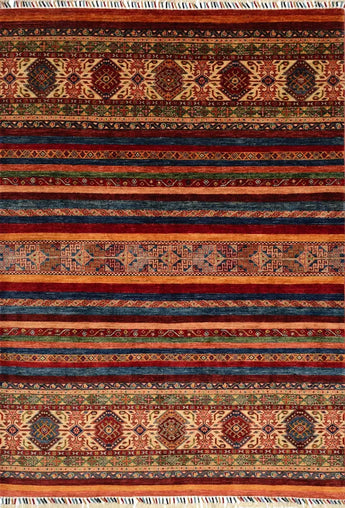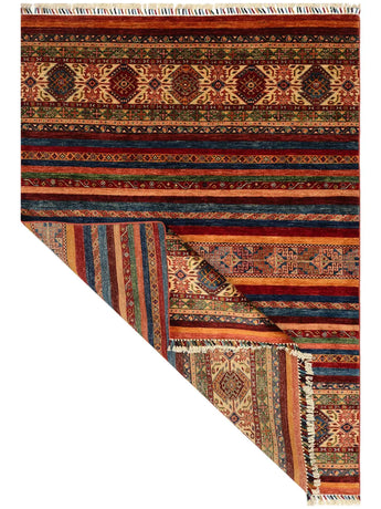 Khorjin rugs from Afghanistan are a type of traditional textile often used as bags or saddlebags by nomadic tribes in the region. These rugs are known for their practical uses and beautiful patterns. Originally created to be used as pack bags by nomadic people, Khorjin rugs are often designed with functionality in mind. The patterns on Khorjin rugs are often geometric and colorful, with symbolic motifs representing the tribe's culture and traditions. Common motifs include diamonds, rhombuses, and other geometric shapes, often in a rich color palette. Khorjin rugs are typically woven from wool, which makes them durable and tough enough for nomadic life. The colors in Khorjin rugs are usually natural, produced from plant dyes, giving them a warm and earthy color palette. Typical colors include red, blue, brown, and beige, but there may also be touches of green and yellow. Khorjin rugs are not just practical, but they are also artworks that tell stories about the tribe's life and culture. Each rug is unique and reflects the weaver's skill and creativity. High-quality materials and craftsmanship make Khorjin rugs long-lasting and valuable investments for customers.