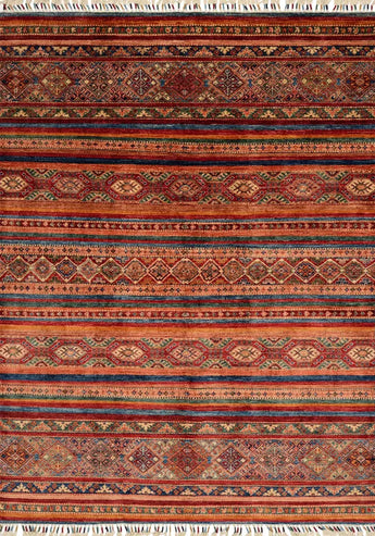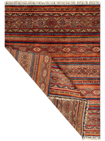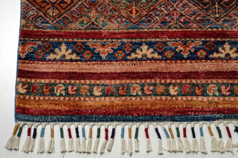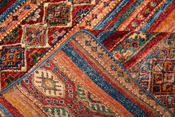 Khorjin rugs from Afghanistan are a type of traditional textile often used as bags or saddlebags by nomadic tribes in the region. These rugs are known for their practical uses and beautiful patterns. Originally created to be used as pack bags by nomadic people, Khorjin rugs are often designed with functionality in mind. The patterns on Khorjin rugs are often geometric and colorful, with symbolic motifs representing the tribe's culture and traditions. Common motifs include diamonds, rhombuses, and other geometric shapes, often in a rich color palette. Khorjin rugs are typically woven from wool, which makes them durable and tough enough for nomadic life. The colors in Khorjin rugs are usually natural, produced from plant dyes, giving them a warm and earthy color palette. Typical colors include red, blue, brown, and beige, but there may also be touches of green and yellow. Khorjin rugs are not just practical, but they are also artworks that tell stories about the tribe's life and culture. Each rug is unique and reflects the weaver's skill and creativity. High-quality materials and craftsmanship make Khorjin rugs long-lasting and valuable investments for customers.