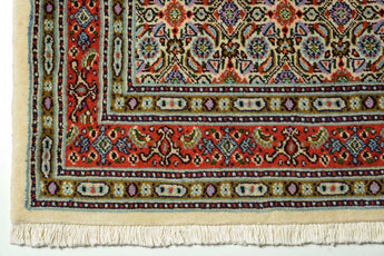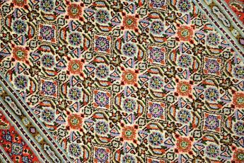 Moud rugs, also known as Mood rugs, are hand-knotted rugs traditionally made in the city of Moud (also spelled Mood) in the Khorasan province of northeastern Persia. These rugs are renowned for their high quality and skilled craftsmanship, which has made them popular both in Iran and internationally. Moud rugs are typically woven from high-quality wool from sheep grazing in the Moud area. The wool is known for its softness and durability. Some Moud rugs may also contain silk threads, especially in the details of the pattern or to add extra sheen and life to the rug. The rugs are hand-knotted using traditional techniques that have been passed down from generation to generation in the area. Typical patterns on Moud rugs include flowers, plants, and geometric figures. Rosettes and medallions are also common in the design. The color palette is often rich and includes traditional colors such as red, blue, green, and beige. Moud rugs are known for their elegance and fine craftsmanship. They possess a classic Oriental style that fits both traditional and modern home environments. The rugs are usually medium to small in size and work well in living rooms, bedrooms, and other spaces. On the international market, Moud rugs are sought after for their high quality and artistic value. They are often seen as investment pieces due to their durability and beauty.