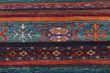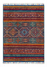 Khorjin-mattor från Afghanistan är en typ av traditionell textil som ofta används som väskor eller sadelväskor av nomadstammar i regionen. Dessa mattor är kända för sina praktiska användningsområden och vackra mönster. Ursprungligen skapade för att användas som packväskor av nomader, Khorjin-mattor är ofta designade med funktionalitet i åtanke. Mönstren på Khorjin-mattor är ofta geometriska och färgglada, med symboliska motiv som representerar stammens kultur och traditioner. Vanliga motiv inkluderar diamanter, romber och andra geometriska former, ofta i en rik färgpalett. Khorjin-mattor är vanligtvis vävda av ull, vilket gör dem hållbara och tuffa nog för nomadlivet. Färgerna i Khorjin-mattor är vanligtvis naturliga, tillverkade av växtfärger, vilket ger dem en varm och jordnära färgpalett. Typiska färger inkluderar rött, blått, brunt och beige, men det kan också finnas inslag av grönt och gult. Khorjin-mattor är inte bara praktiska, utan de är också konstverk som berättar historier om stammens liv och kultur. Varje matta är unik och speglar vävarens skicklighet och kreativitet. Högkvalitativa material och hantverk gör Khorjin-mattor till långvariga och värdefulla investeringar för kunderna.