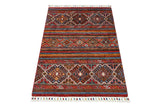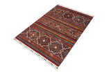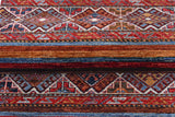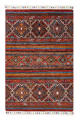 Khorjin-mattor från Afghanistan är en typ av traditionell textil som ofta används som väskor eller sadelväskor av nomadstammar i regionen. Dessa mattor är kända för sina praktiska användningsområden och vackra mönster. Ursprungligen skapade för att användas som packväskor av nomader, Khorjin-mattor är ofta designade med funktionalitet i åtanke. Mönstren på Khorjin-mattor är ofta geometriska och färgglada, med symboliska motiv som representerar stammens kultur och traditioner. Vanliga motiv inkluderar diamanter, romber och andra geometriska former, ofta i en rik färgpalett. Khorjin-mattor är vanligtvis vävda av ull, vilket gör dem hållbara och tuffa nog för nomadlivet. Färgerna i Khorjin-mattor är vanligtvis naturliga, tillverkade av växtfärger, vilket ger dem en varm och jordnära färgpalett. Typiska färger inkluderar rött, blått, brunt och beige, men det kan också finnas inslag av grönt och gult. Khorjin-mattor är inte bara praktiska, utan de är också konstverk som berättar historier om stammens liv och kultur. Varje matta är unik och speglar vävarens skicklighet och kreativitet. Högkvalitativa material och hantverk gör Khorjin-mattor till långvariga och värdefulla investeringar för kunderna.