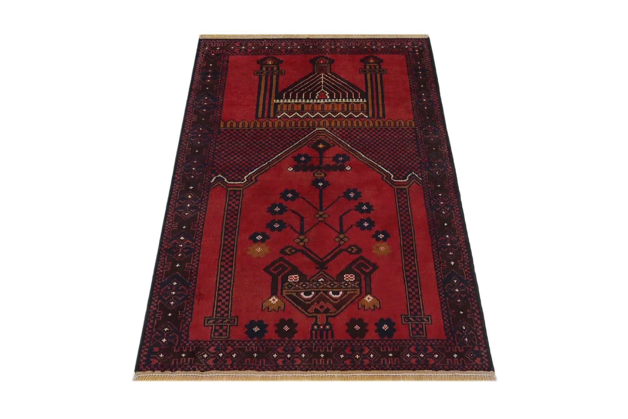 Baluch rugs originate from areas inhabited by the Baluch people, mainly in eastern Iran, western Afghanistan, and southwestern Pakistan. Baluch are known for their nomadic lifestyle, and their rugs reflect this cultural and geographical diversity. Baluch rugs often have intricate geometric patterns and sometimes stylized motifs that represent nature, such as flowers and animals. Common patterns include guls and octagons. Typical colors include deep red, blue, and brown, often combined with white and black accents to create contrast. These rugs are usually hand-woven with wool on a cotton base, giving them both durability and softness. Wool is the most common material used, but sometimes goat hair or silk is also used. Traditionally, these rugs are woven by hand on horizontal or vertical looms, a process that can take several months depending on the size and comple x ity of the rug. Baluch rugs were primarily used as floor coverings in nomadic tents, but today they are also used as decorative wall hangings and sometimes as prayer mats. Many of the patterns and colors have symbolic meanings, such as protective amulets or symbols of prosperity and fertility. Baluch rugs are not only practical items but also works of art that tell a rich story about the people and cultures that created them.