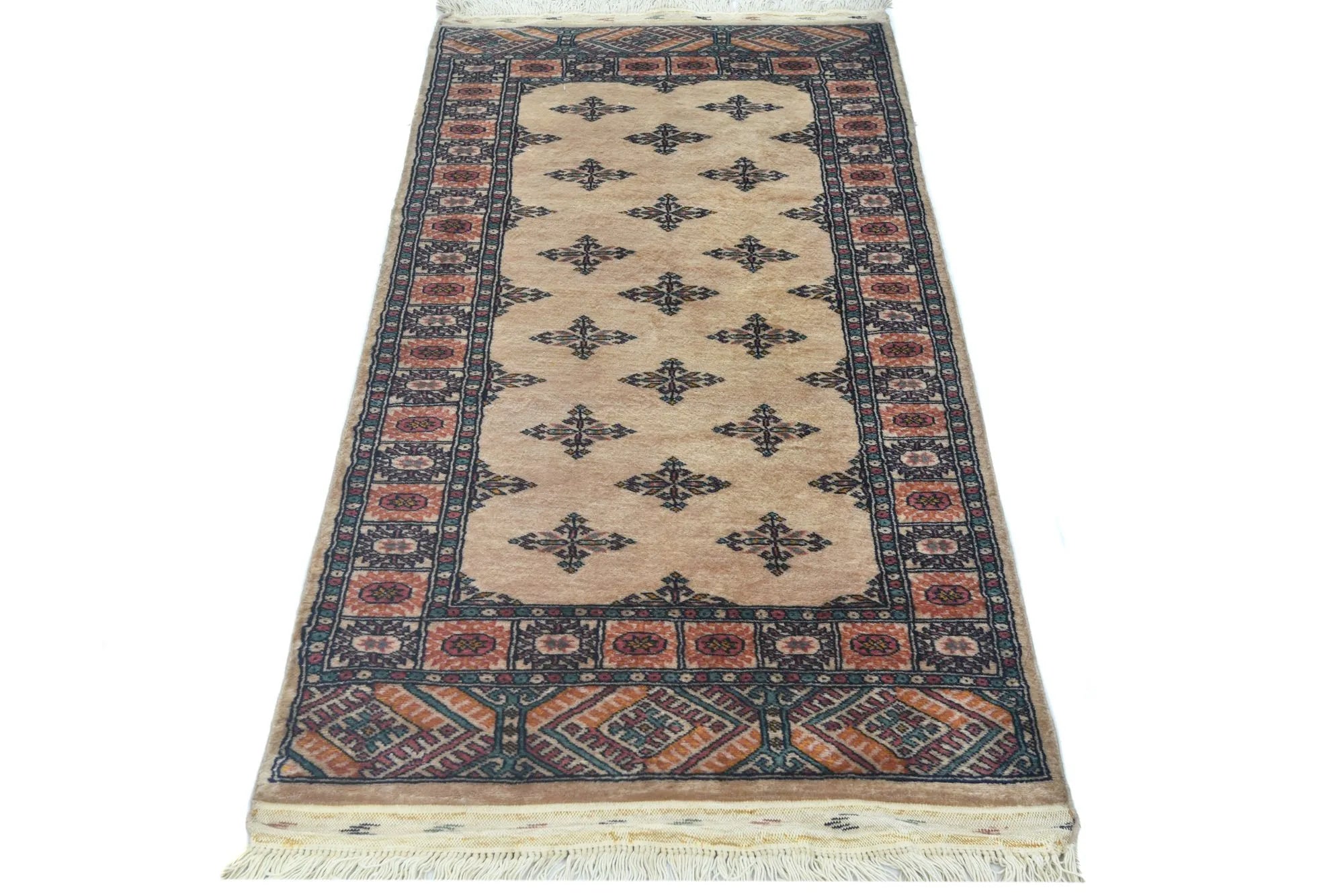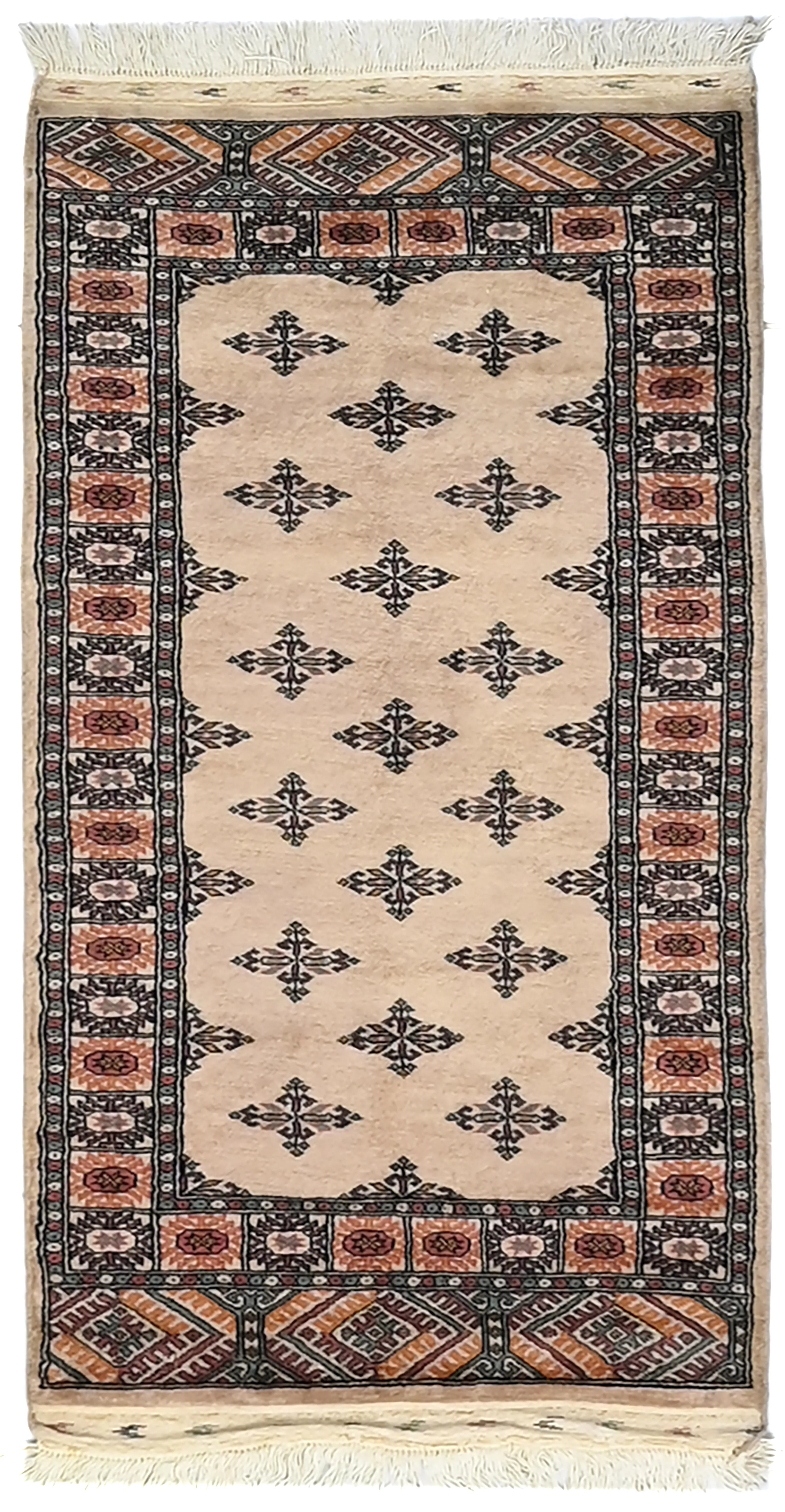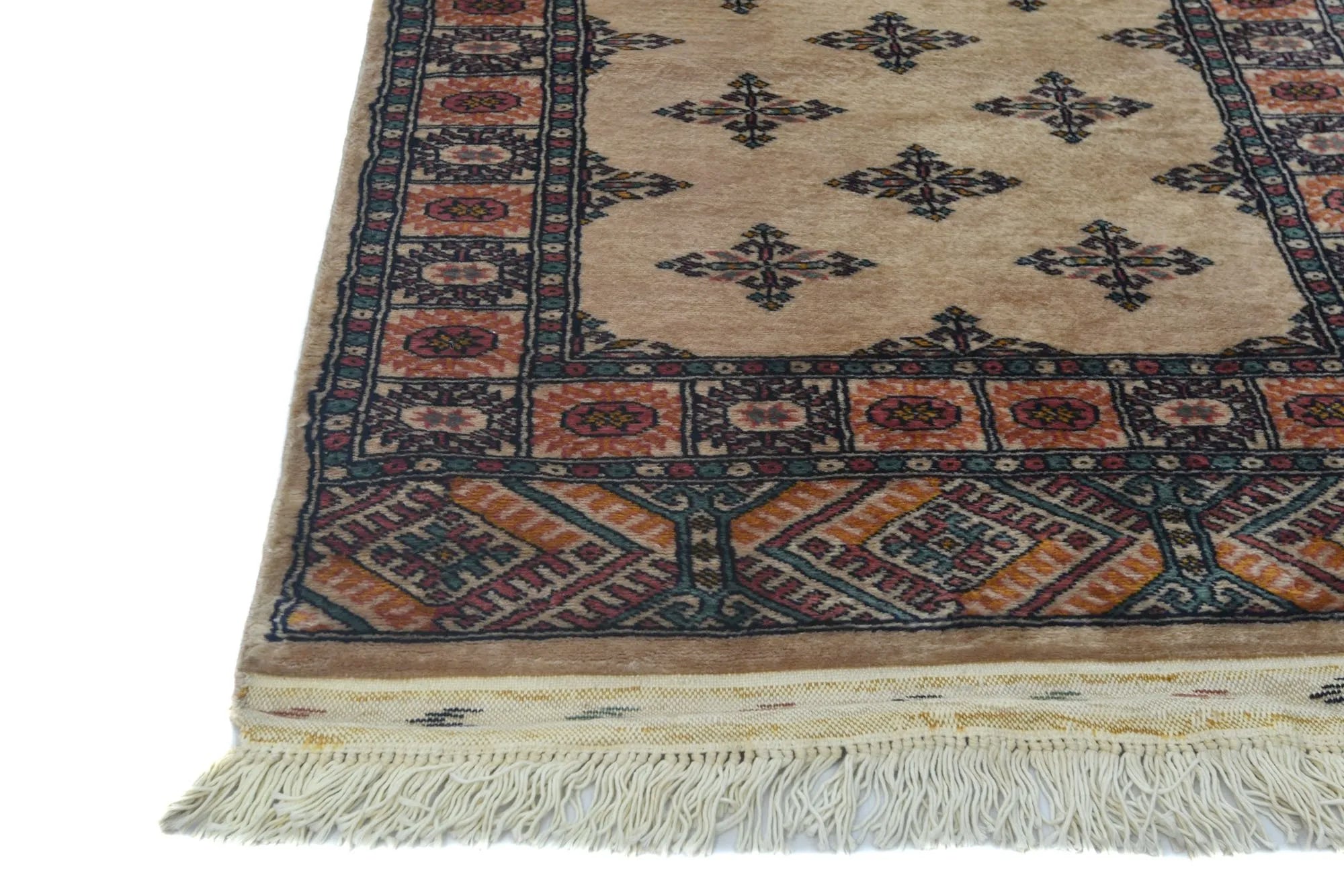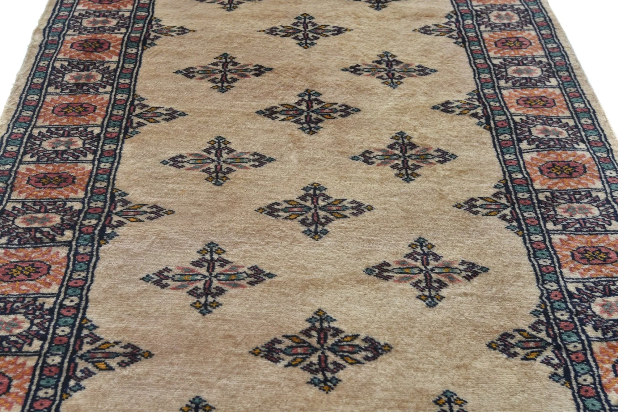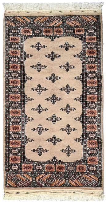 Bokhara carpets from Pakistan are known for their elegant and classic patterns, inspired by traditional Central Asian design. They are named after the city of Bokhara (now Bukhara) in Uzbekistan, although those manufactured in Pakistan have developed their own unique style and feel. Bokhara carpets from Pakistan are primarily produced in the Punjab province and other parts of the country. Pakistan is known for its rich tradition of carpet weaving and has become one of the leading e x porters of hand-knotted carpets. The design of Bokhara carpets originates from the Turkmen nomadic tribe Tekke, but Pakistani versions have adapted and developed these patterns to create their own distinct style. This adaptation has led to a unique and recognized variant of Bokhara carpets. Bokhara carpets are characterized by their typical geometric patterns with repeated octagons or guls, surrounded by smaller geometric elements. There are also variations with more floral or stylized patterns. Traditional Bokhara carpets are often in deep red, wine red, or dark blue, but modern variants may also be found in lighter and more varied colors such as beige, gray, and green. Bokhara carpets from Pakistan are usually made of fine wool which is soft and durable. They may also have elements of silk to enhance the gloss and softness. The warp and weft are usually made of cotton, which provides stability and structure. These carpets are hand-knotted with a medium to high knot density, which gives them a dense and durable construction. The knotting technique in Pakistan is known for its precision and quality. These carpets are very versatile and can be used in various environments, from traditional to modern. They are also popular as art objects due to their aesthetic and artistic value.