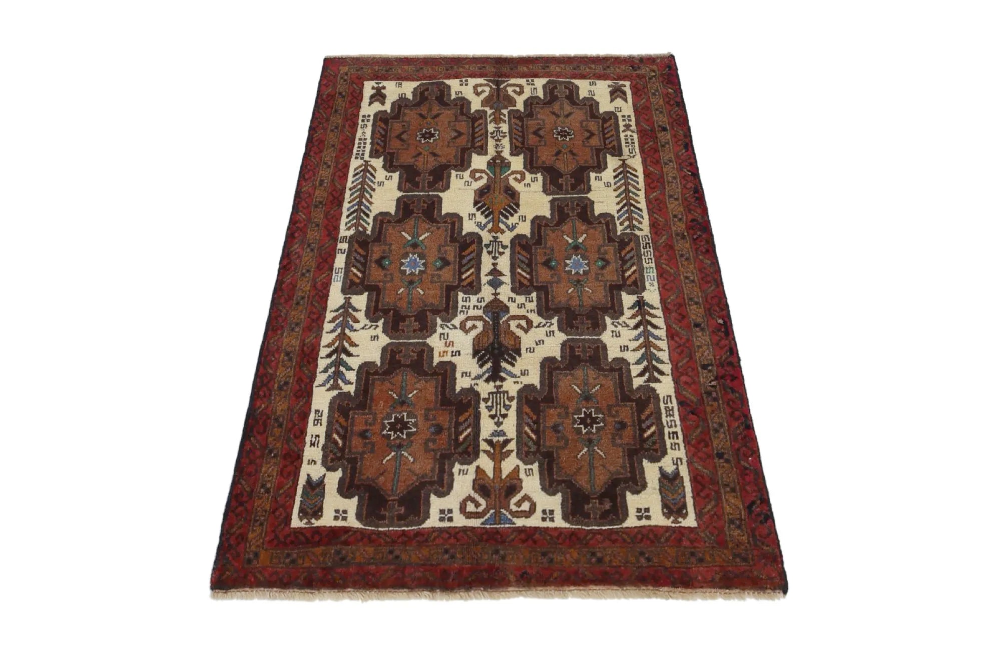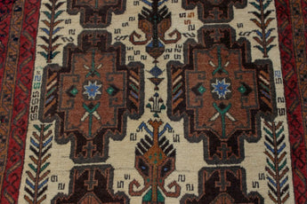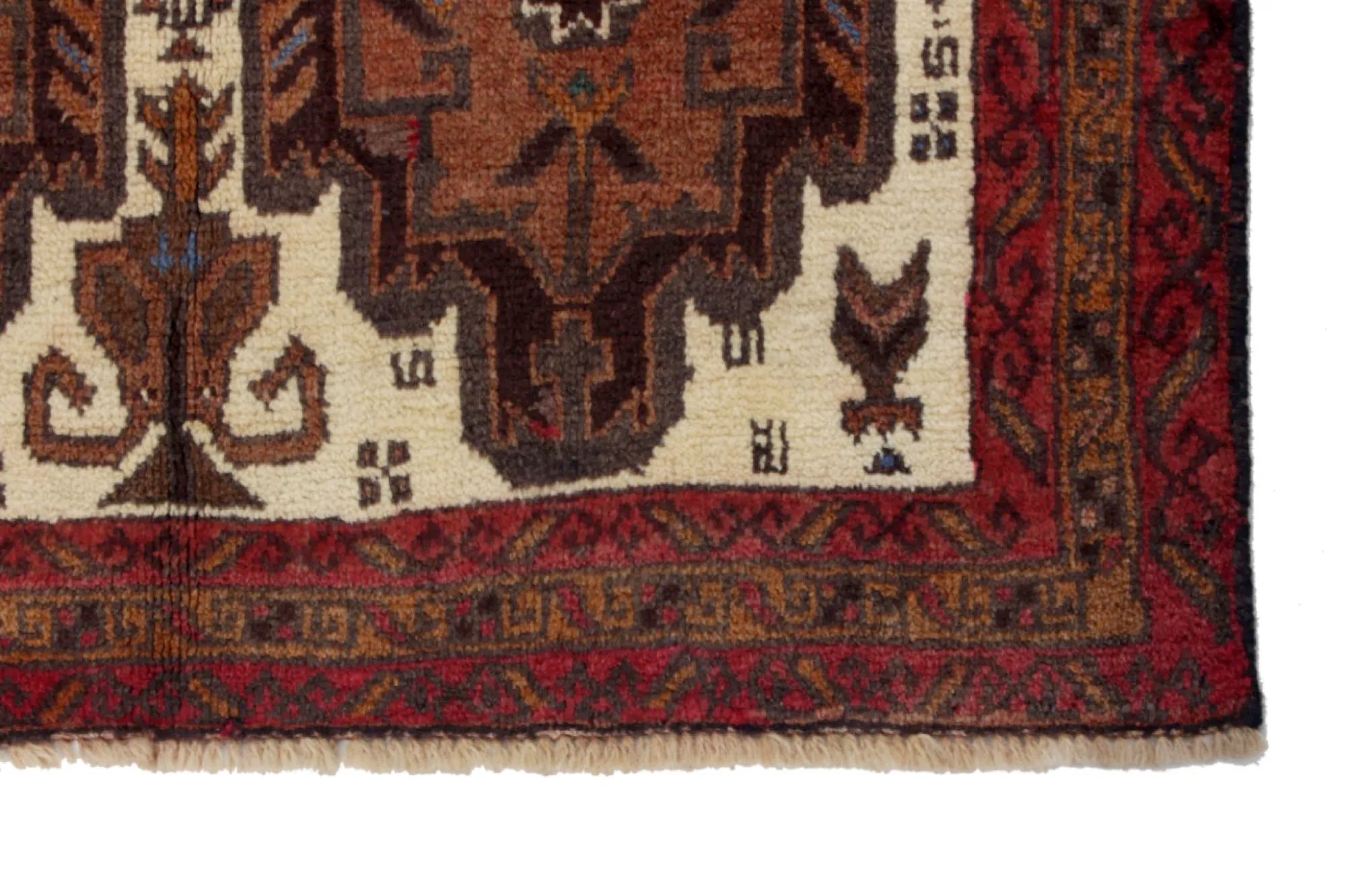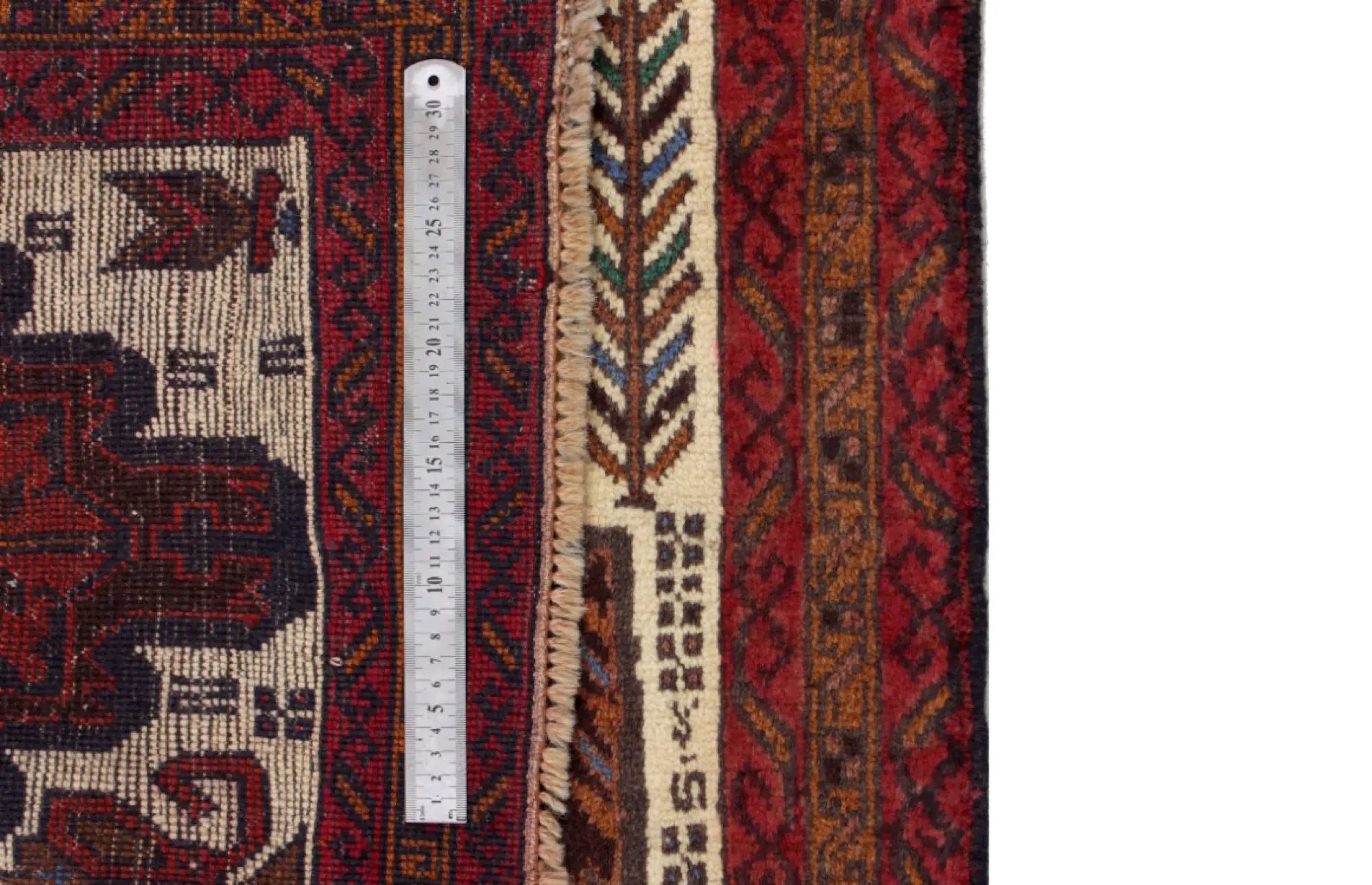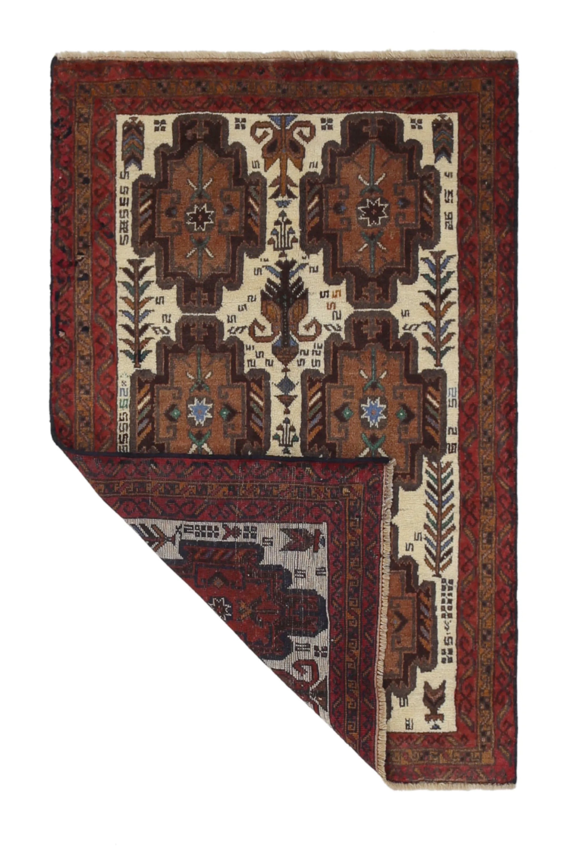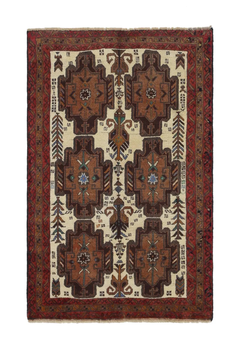 Baluch rugs originate from areas inhabited by the Baluch people, mainly in eastern Iran, western Afghanistan, and southwestern Pakistan. Baluch are known for their nomadic lifestyle, and their rugs reflect this cultural and geographical diversity. Baluch rugs often have intricate geometric patterns and sometimes stylized motifs that represent nature, such as flowers and animals. Common patterns include guls and octagons. Typical colors include deep red, blue, and brown, often combined with white and black accents to create contrast. These rugs are usually hand-woven with wool on a cotton base, giving them both durability and softness. Wool is the most common material used, but sometimes goat hair or silk is also used. Traditionally, these rugs are woven by hand on horizontal or vertical looms, a process that can take several months depending on the size and comple x ity of the rug. Baluch rugs were primarily used as floor coverings in nomadic tents, but today they are also used as decorative wall hangings and sometimes as prayer mats. Many of the patterns and colors have symbolic meanings, such as protective amulets or symbols of prosperity and fertility. Baluch rugs are not only practical items but also works of art that tell a rich story about the people and cultures that created them.