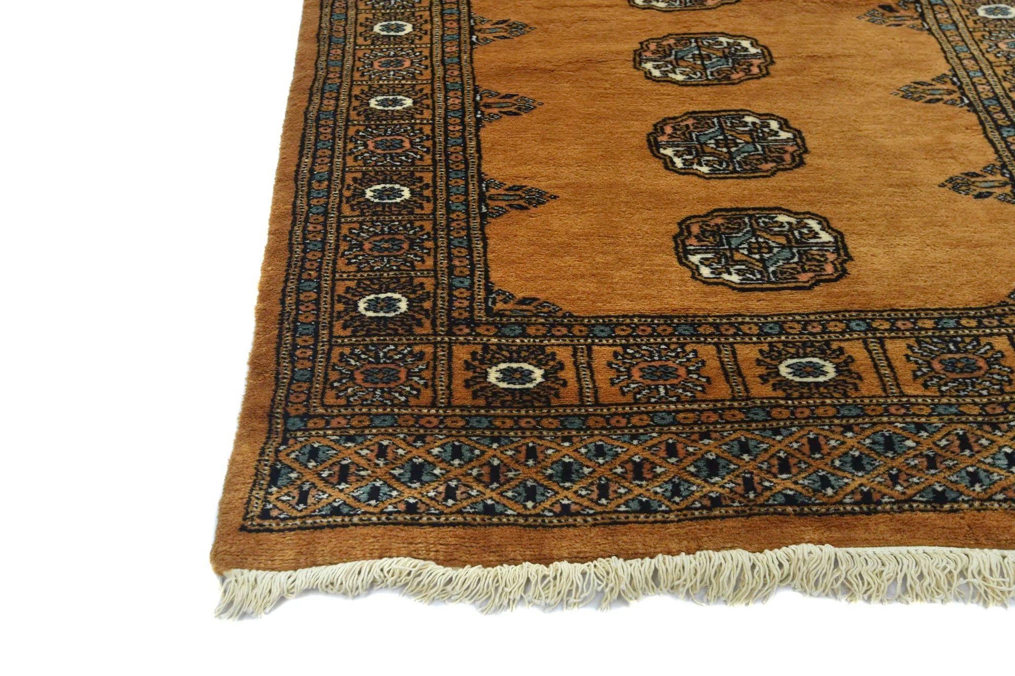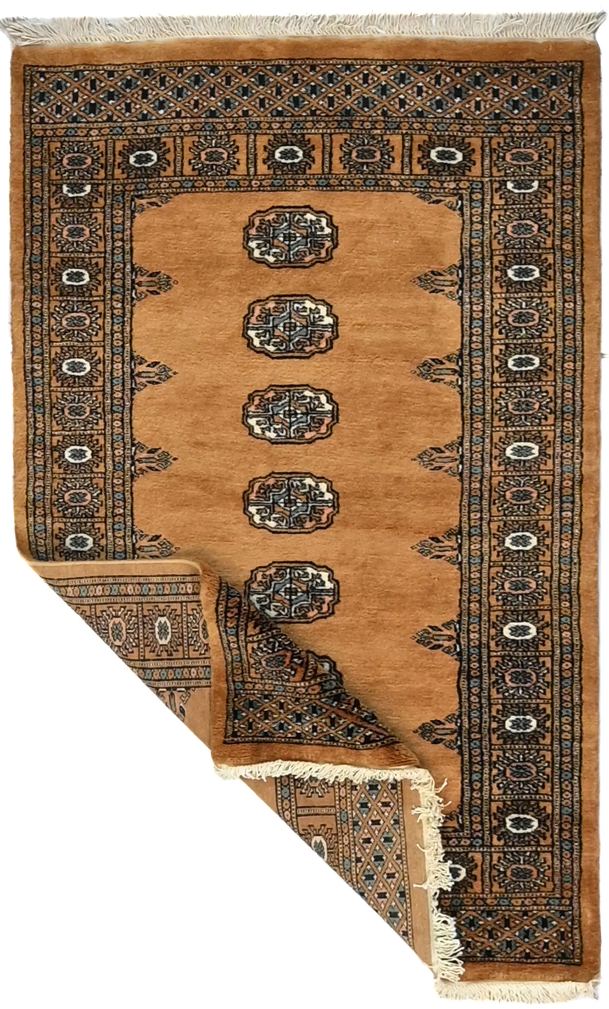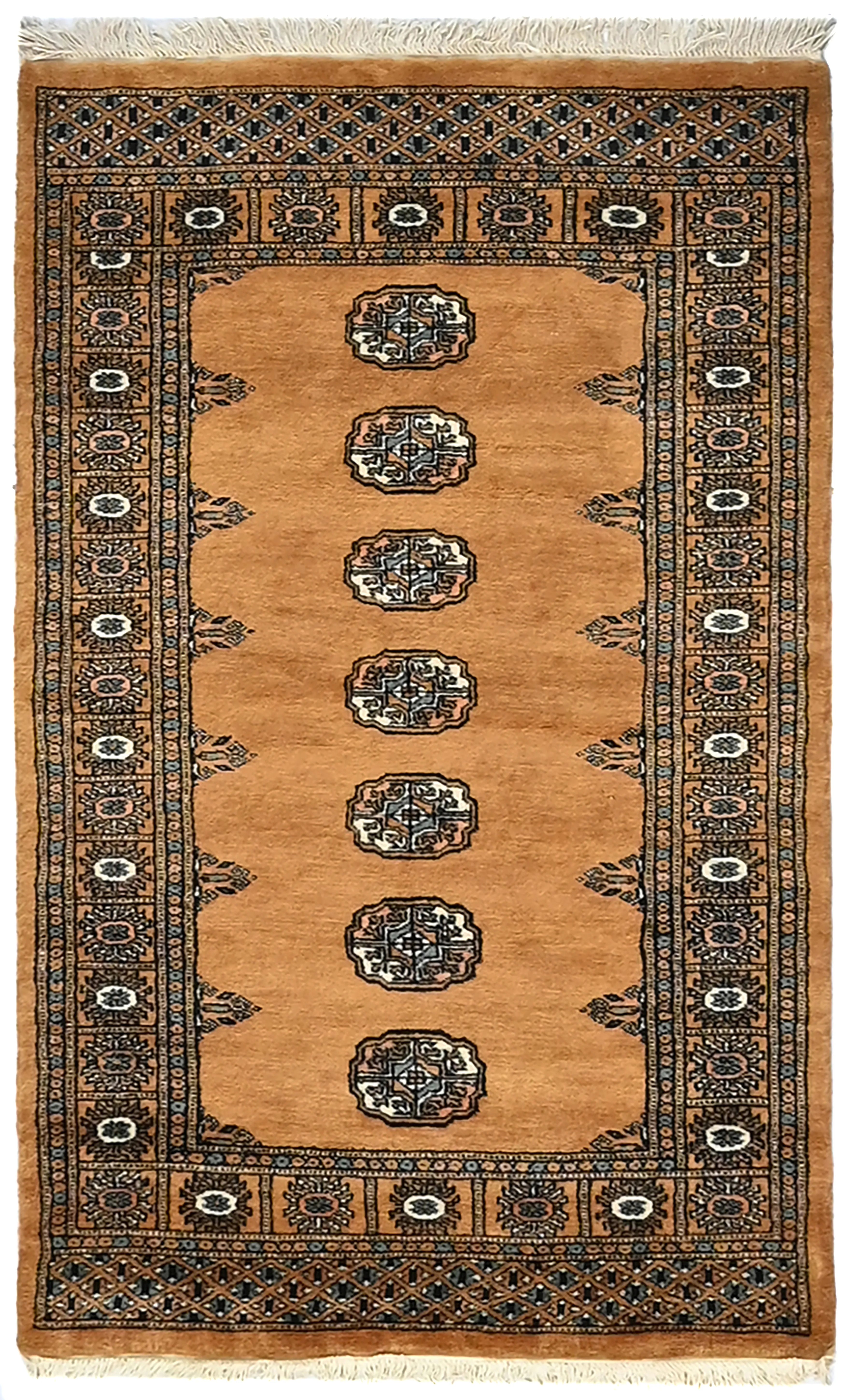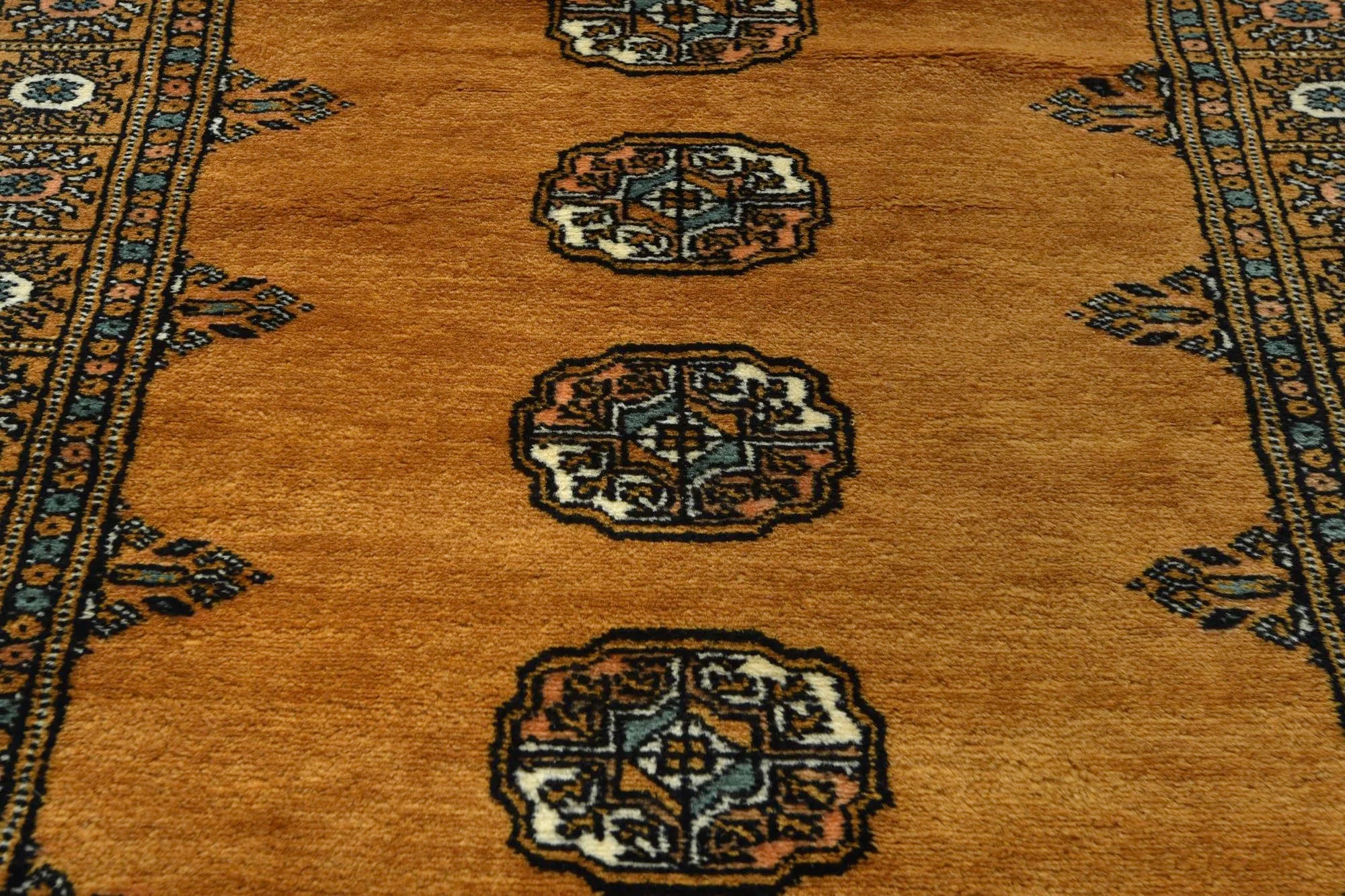 Bokhara carpets from Pakistan are known for their elegant and classic patterns, inspired by traditional Central Asian design. They are named after the city of Bokhara (now Bukhara) in Uzbekistan, although those manufactured in Pakistan have developed their own unique style and feel. Bokhara carpets from Pakistan are primarily produced in the Punjab province and other parts of the country. Pakistan is known for its rich tradition of carpet weaving and has become one of the leading e x porters of hand-knotted carpets. The design of Bokhara carpets originates from the Turkmen nomadic tribe Tekke, but Pakistani versions have adapted and developed these patterns to create their own distinct style. This adaptation has led to a unique and recognized variant of Bokhara carpets. Bokhara carpets are characterized by their typical geometric patterns with repeated octagons or guls, surrounded by smaller geometric elements. There are also variations with more floral or stylized patterns. Traditional Bokhara carpets are often in deep red, wine red, or dark blue, but modern variants may also be found in lighter and more varied colors such as beige, gray, and green. Bokhara carpets from Pakistan are usually made of fine wool which is soft and durable. They may also have elements of silk to enhance the gloss and softness. The warp and weft are usually made of cotton, which provides stability and structure. These carpets are hand-knotted with a medium to high knot density, which gives them a dense and durable construction. The knotting technique in Pakistan is known for its precision and quality. These carpets are very versatile and can be used in various environments, from traditional to modern. They are also popular as art objects due to their aesthetic and artistic value.