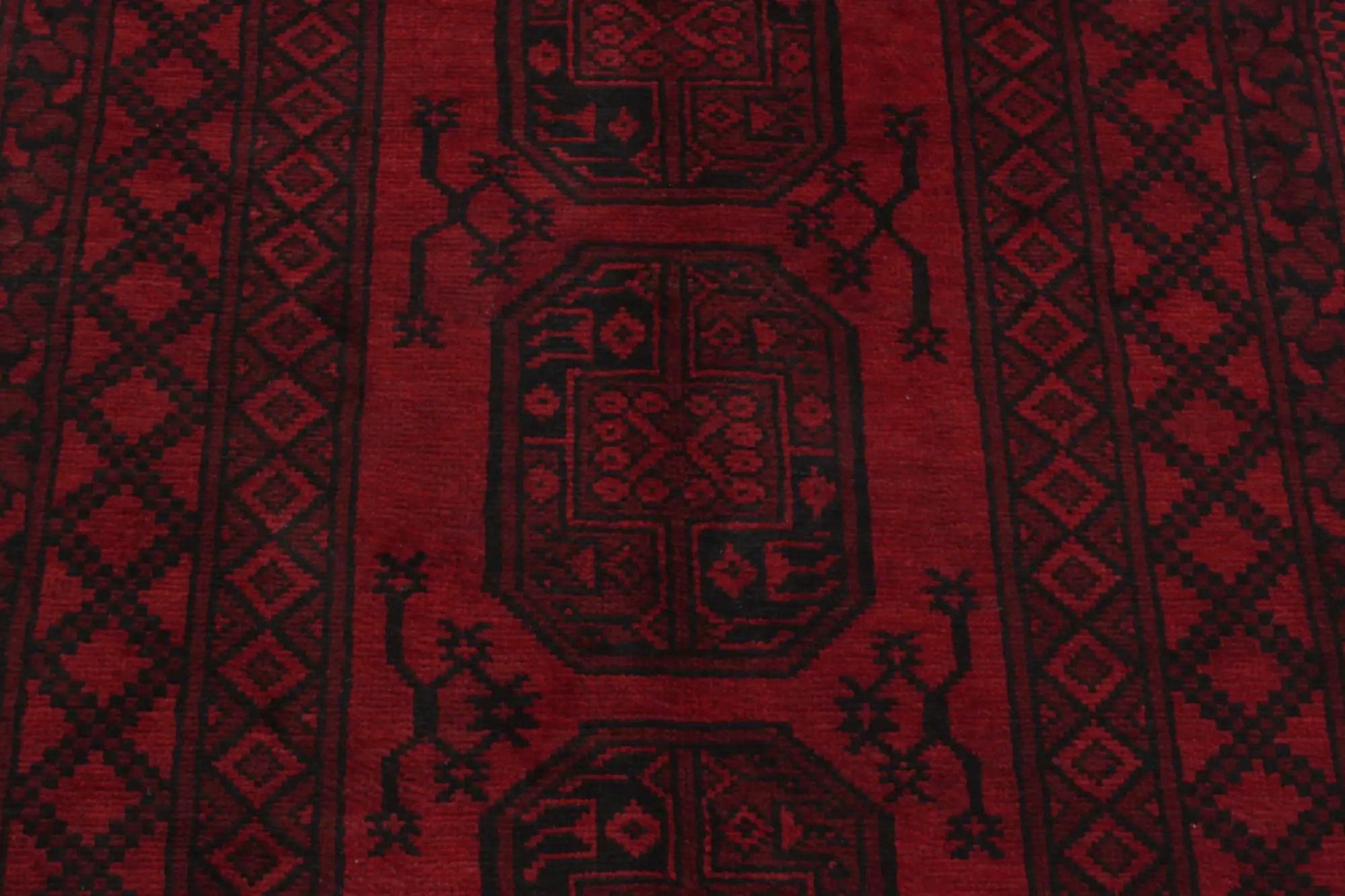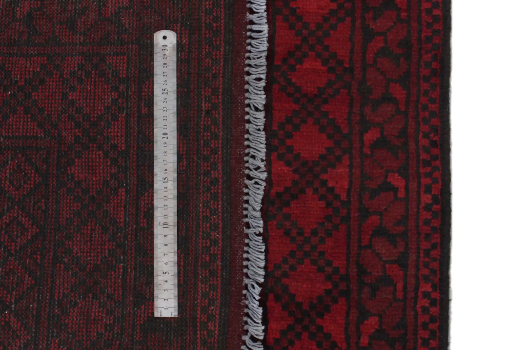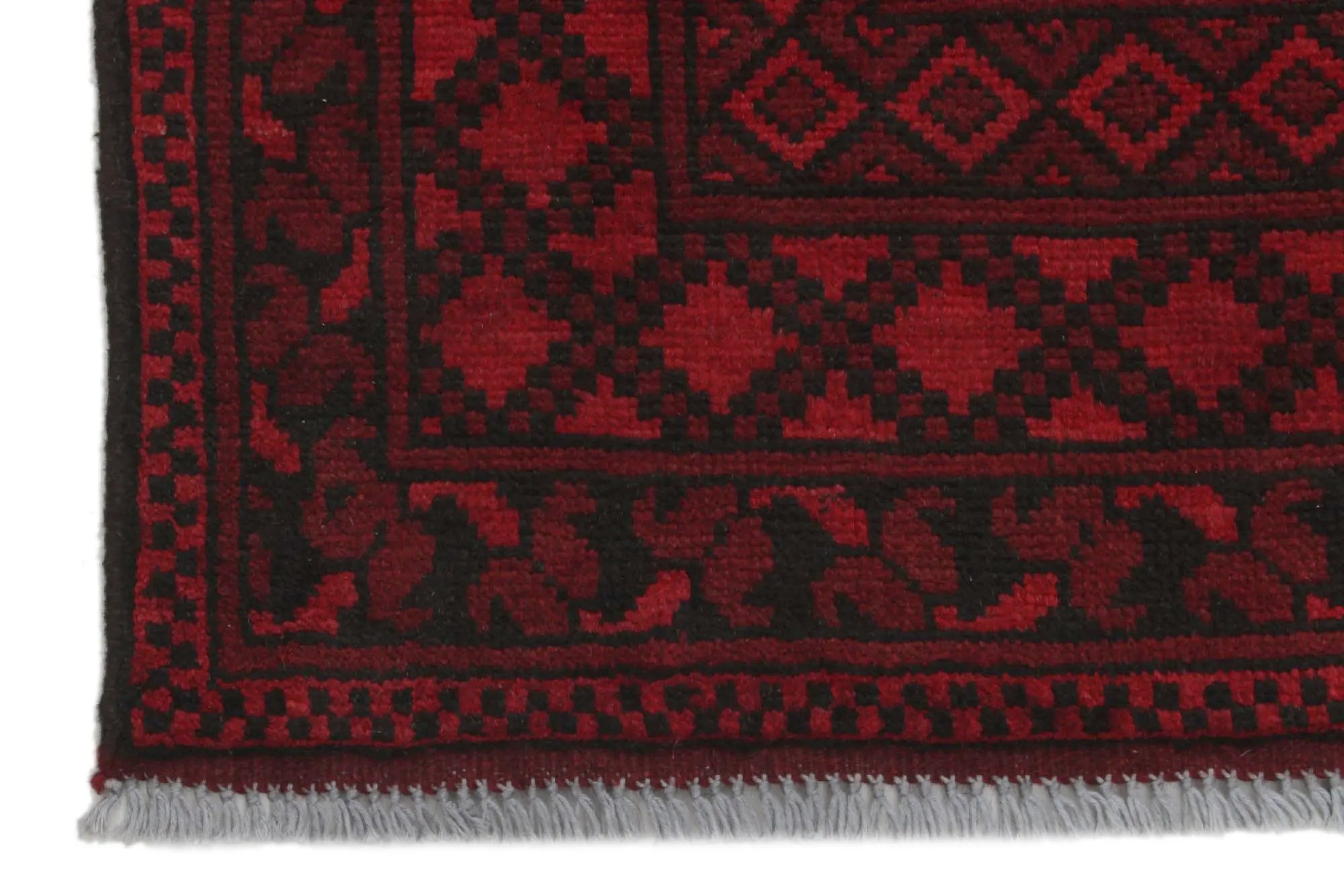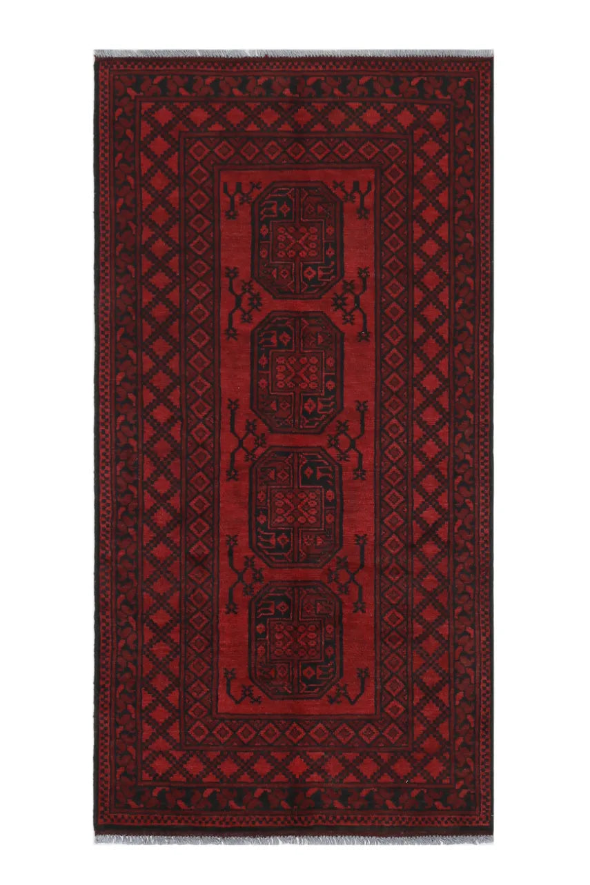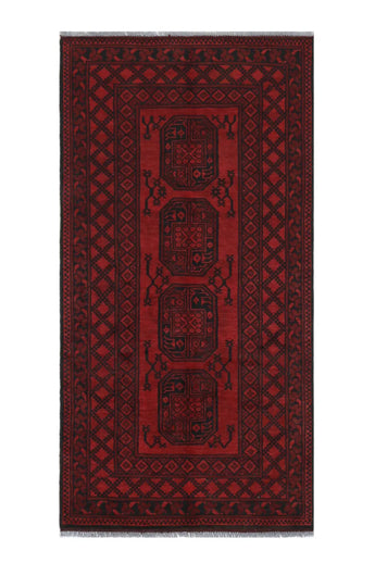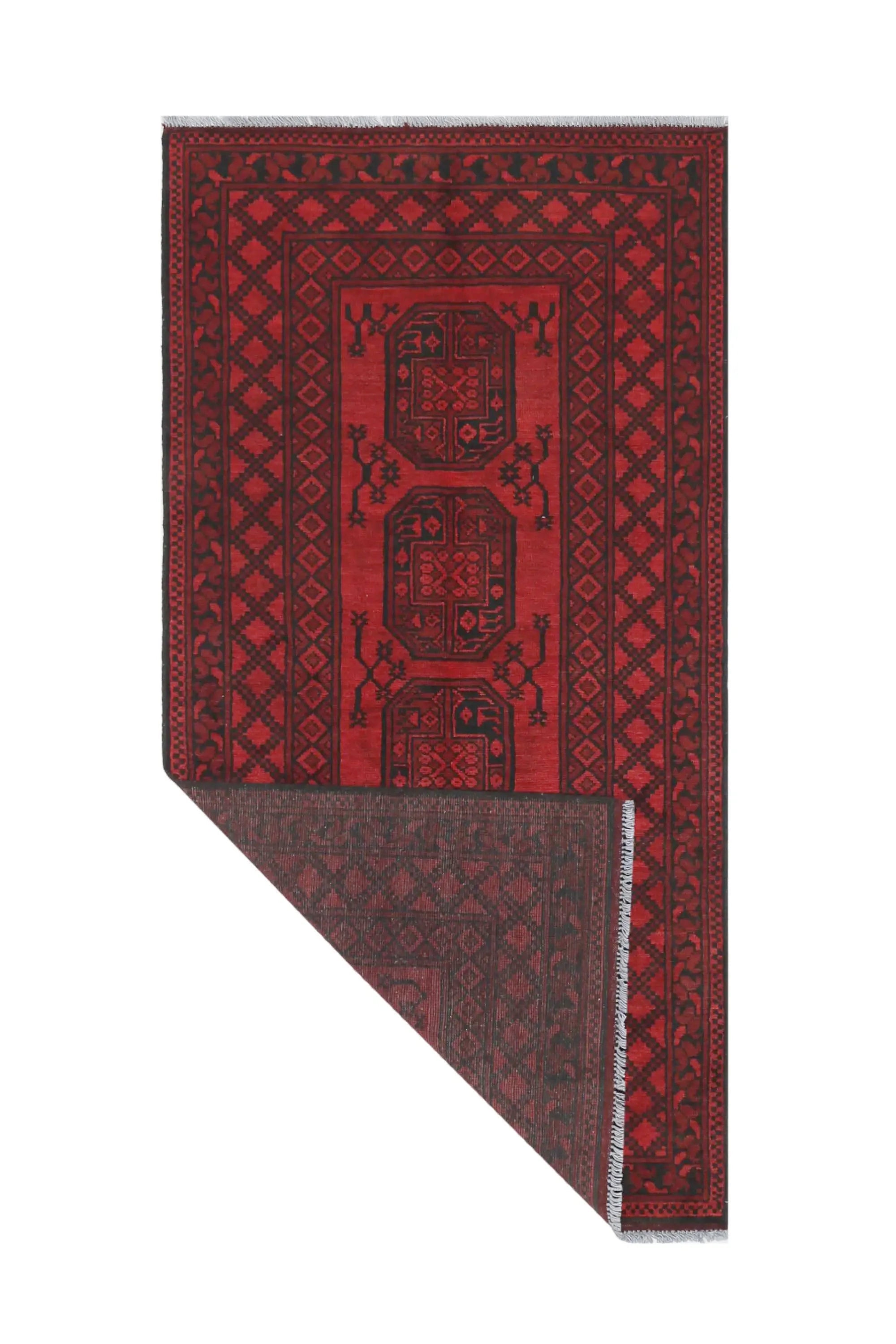 Discover this exquisite hand-knotted Akche rug from Afghanistan, crafted in rich, deep red and black tones that bring warmth and elegance to any interior. Made from 100% pure wool, including the fringes, it contains no synthetic materials, giving it a naturally soft, durable, and authentic feel. The traditional “elephant foot” motif, characteristic of Akche rugs, adds a timeless and culturally rich expression. A perfect choice for anyone seeking a rug that unites craftsmanship, character, and classic oriental beauty.