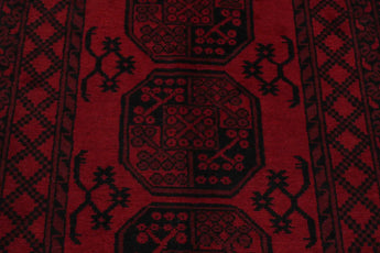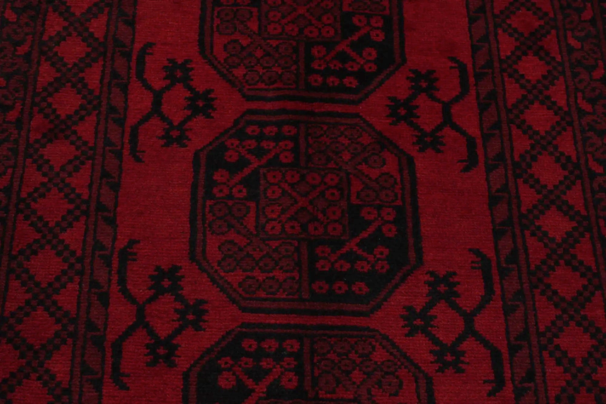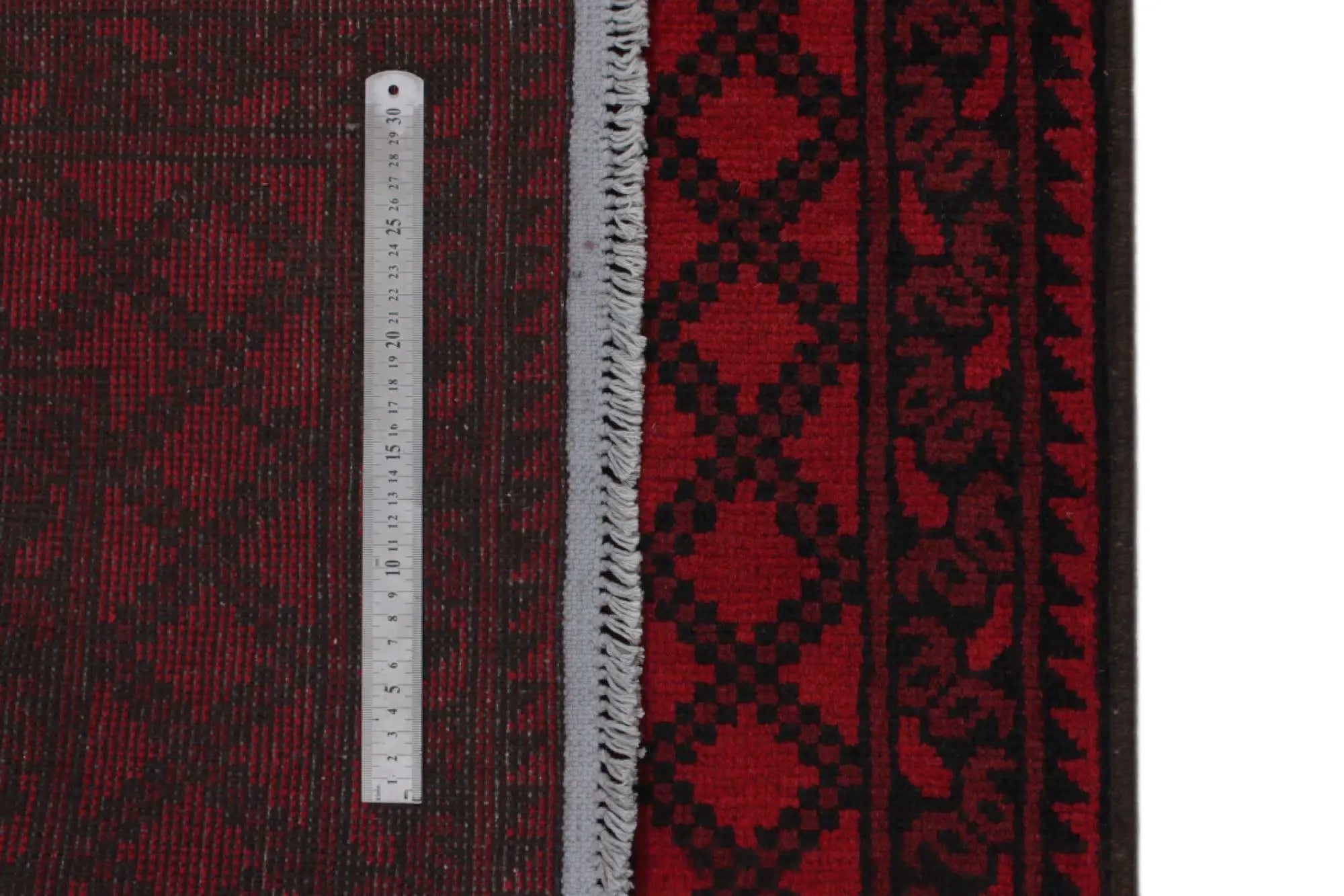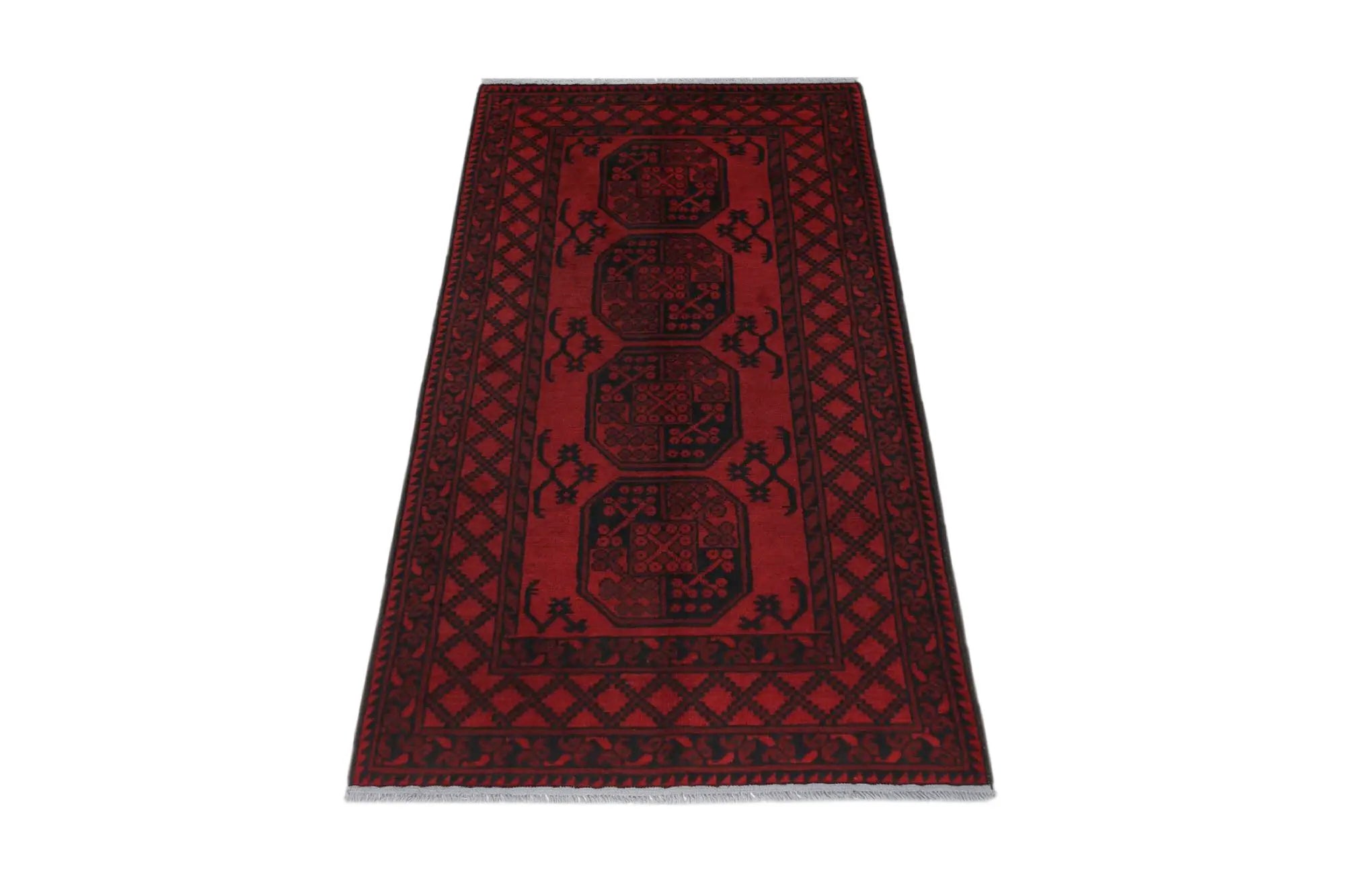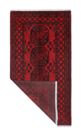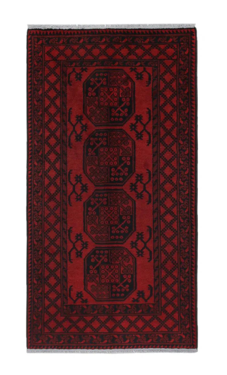 Discover this exquisite hand-knotted Akche rug from Afghanistan, crafted in rich, deep red and black tones that bring warmth and elegance to any interior. Made from 100% pure wool, including the fringes, it contains no synthetic materials, giving it a naturally soft, durable, and authentic feel. The traditional “elephant foot” motif, characteristic of Akche rugs, adds a timeless and culturally rich expression. A perfect choice for anyone seeking a rug that unites craftsmanship, character, and classic oriental beauty.