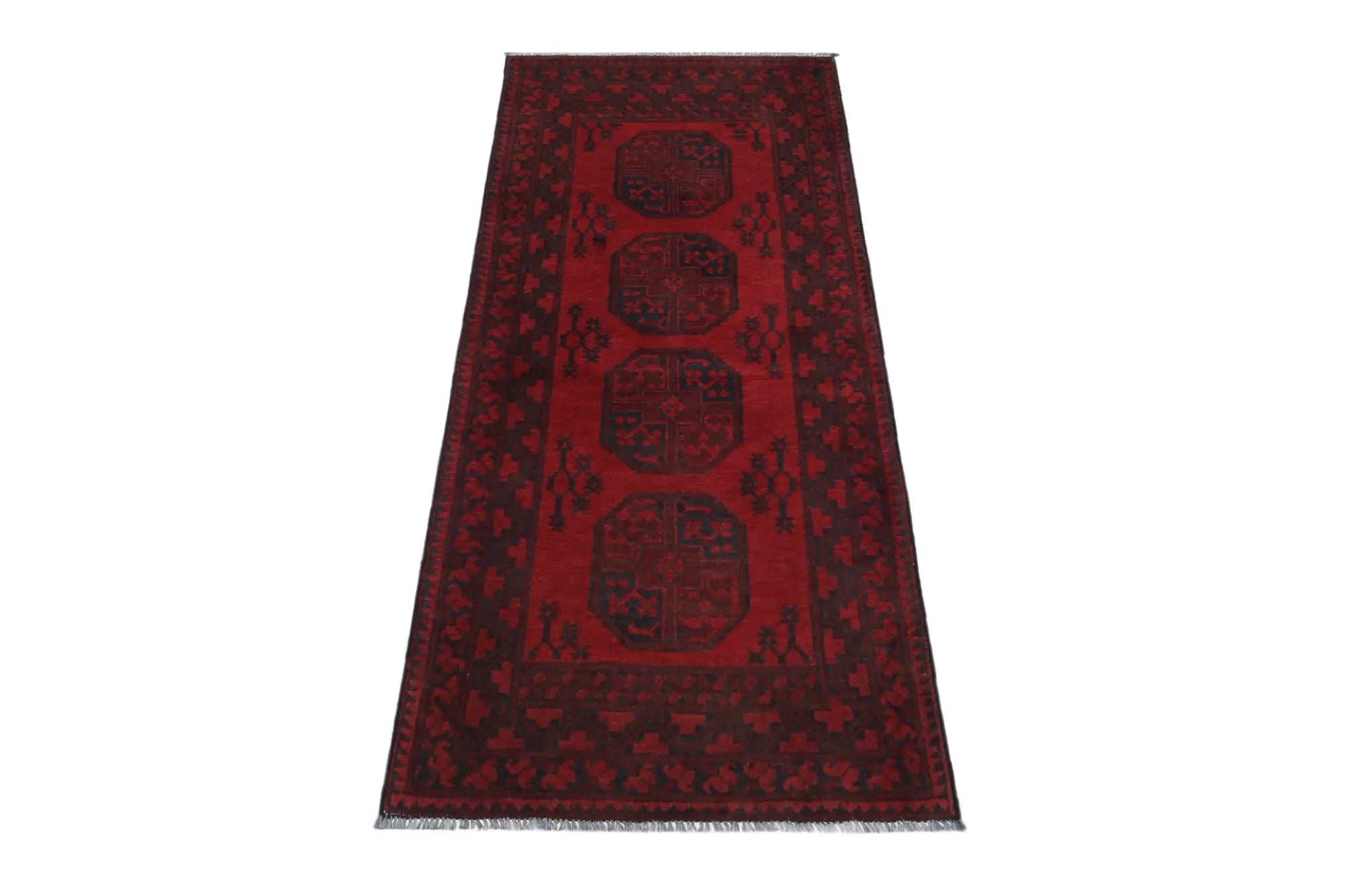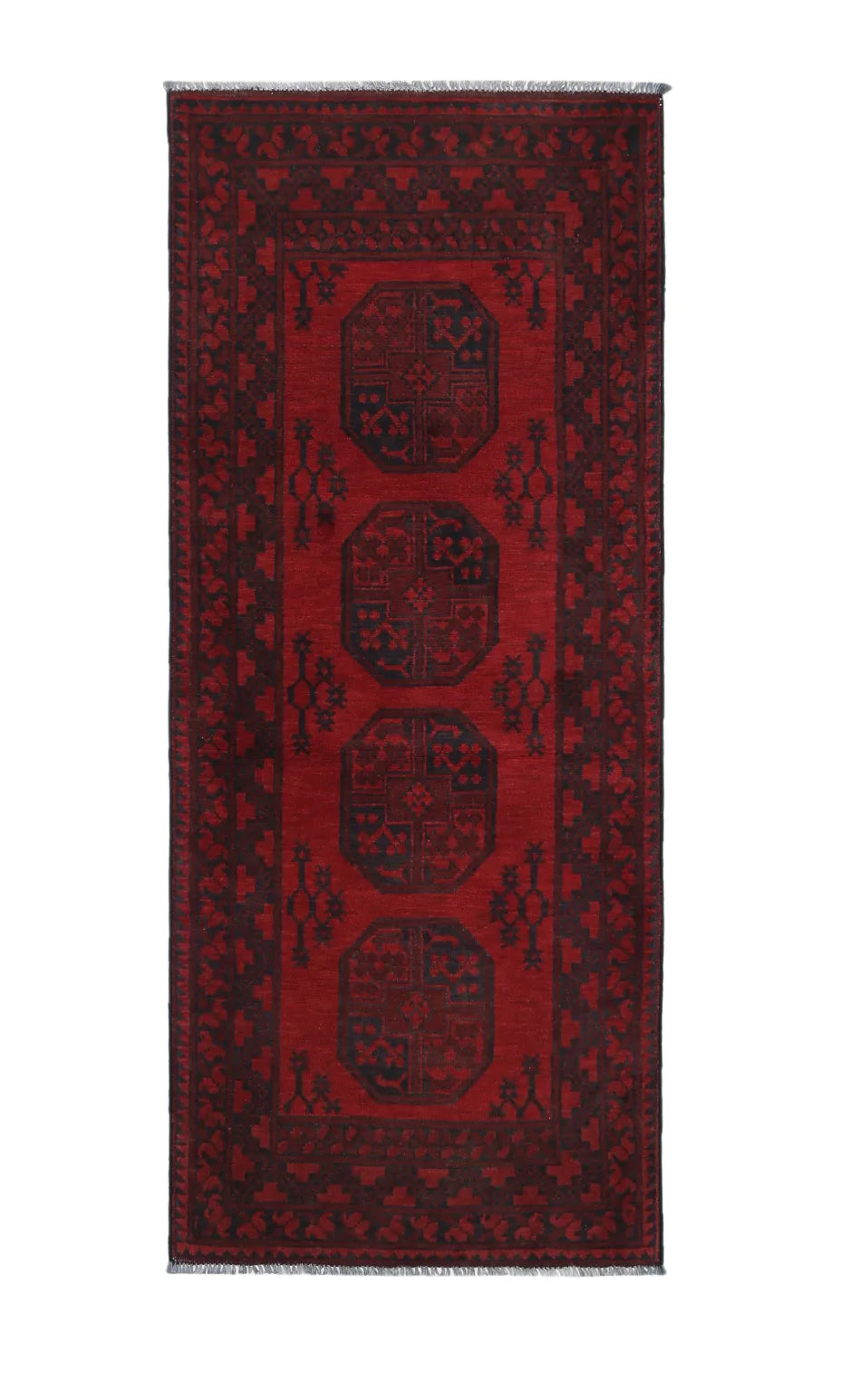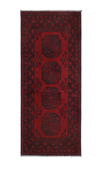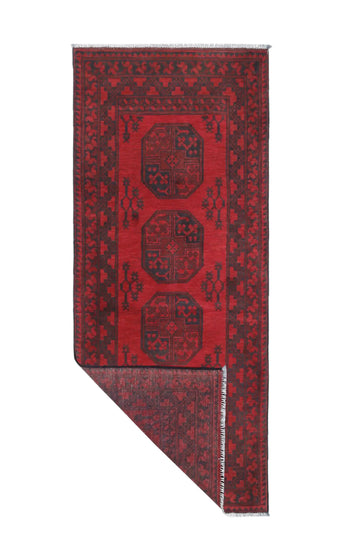 Discover this exquisite hand-knotted Akche rug from Afghanistan, crafted in rich, deep red and black tones that bring warmth and elegance to any interior. Made from 100% pure wool, including the fringes, it contains no synthetic materials, giving it a naturally soft, durable, and authentic feel. The traditional “elephant foot” motif, characteristic of Akche rugs, adds a timeless and culturally rich expression. A perfect choice for anyone seeking a rug that unites craftsmanship, character, and classic oriental beauty.