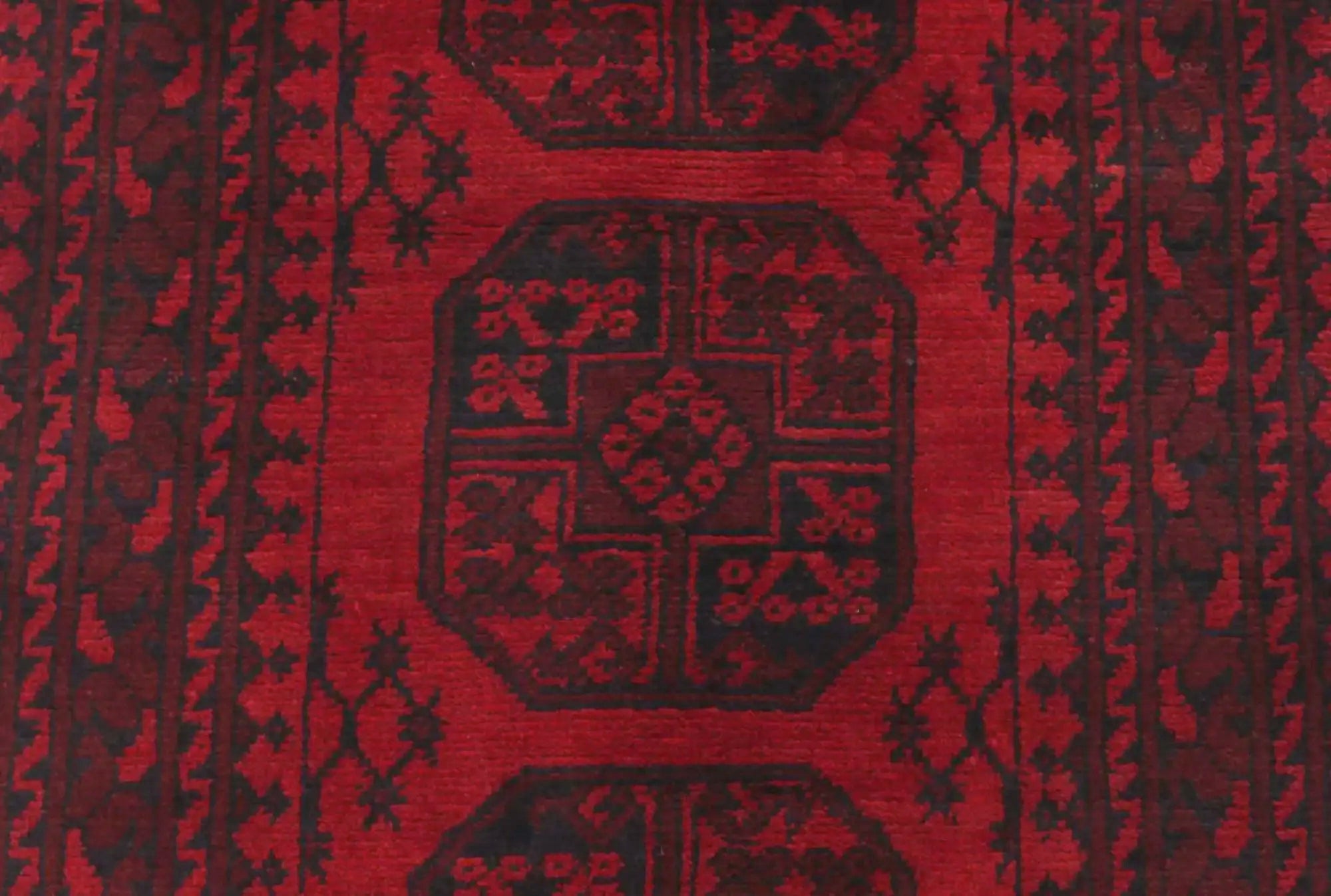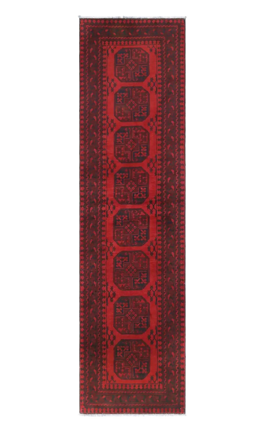 Discover this exquisite hand-knotted Akche rug from Afghanistan, crafted in rich, deep red and black tones that bring warmth and elegance to any interior. Made from 100% pure wool, including the fringes, it contains no synthetic materials, giving it a naturally soft, durable, and authentic feel. The traditional “elephant foot” motif, characteristic of Akche rugs, adds a timeless and culturally rich expression. A perfect choice for anyone seeking a rug that unites craftsmanship, character, and classic oriental beauty.