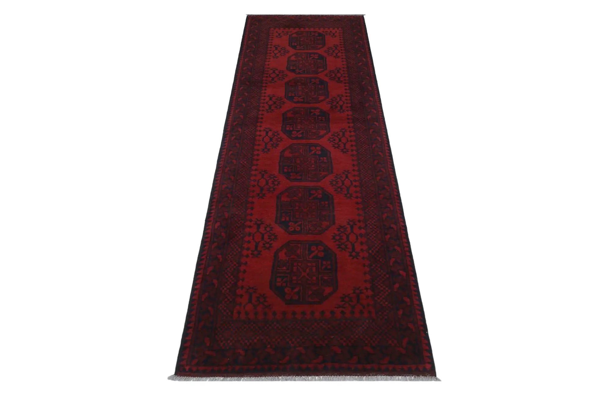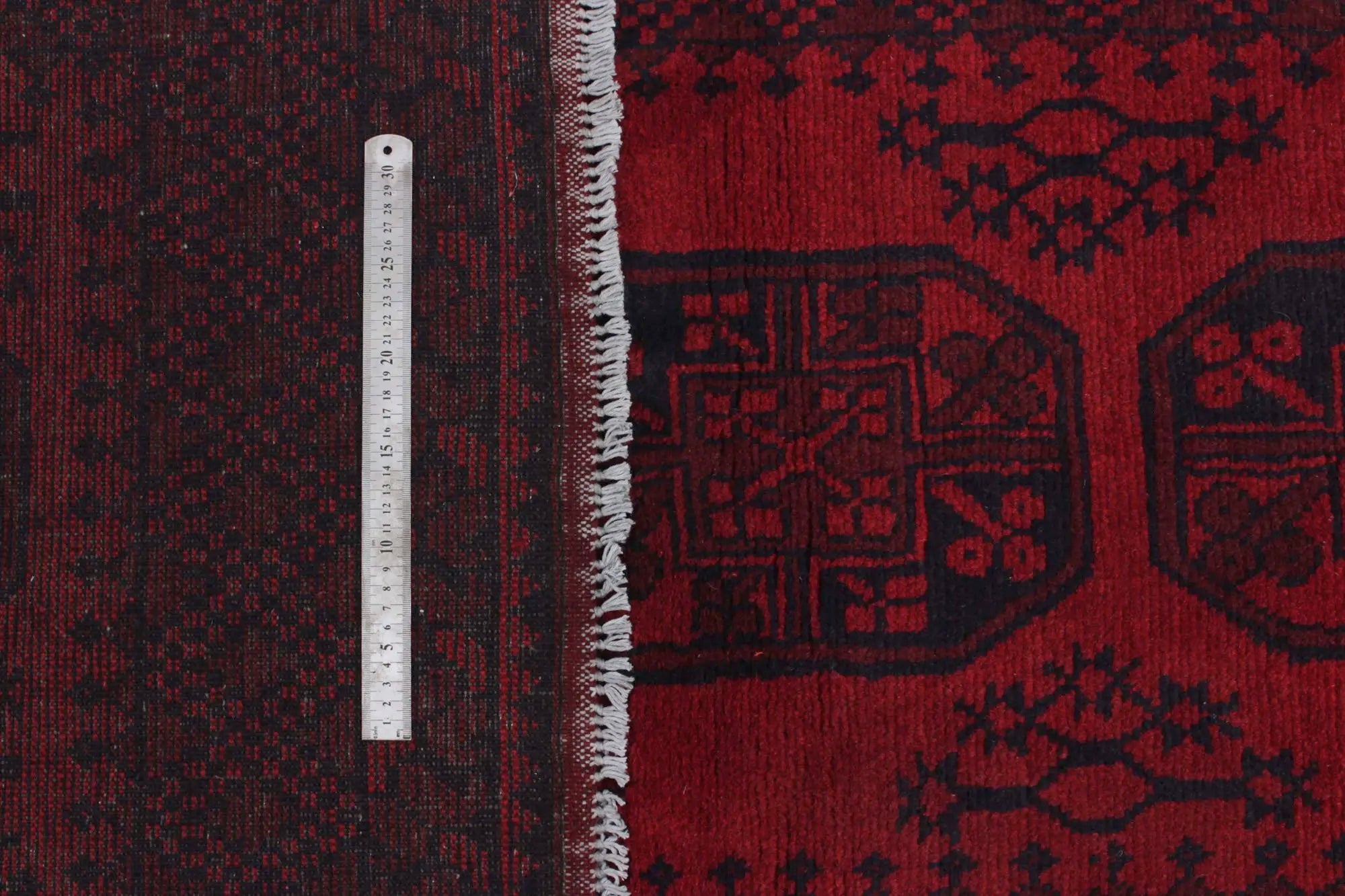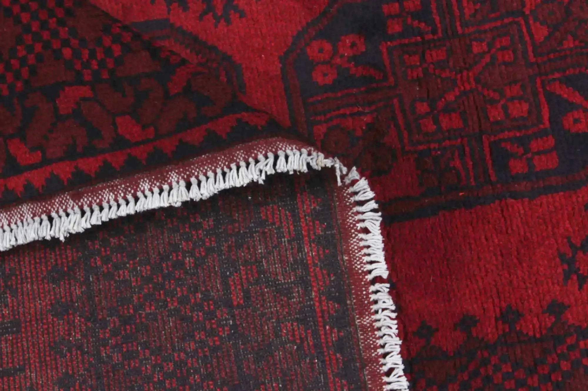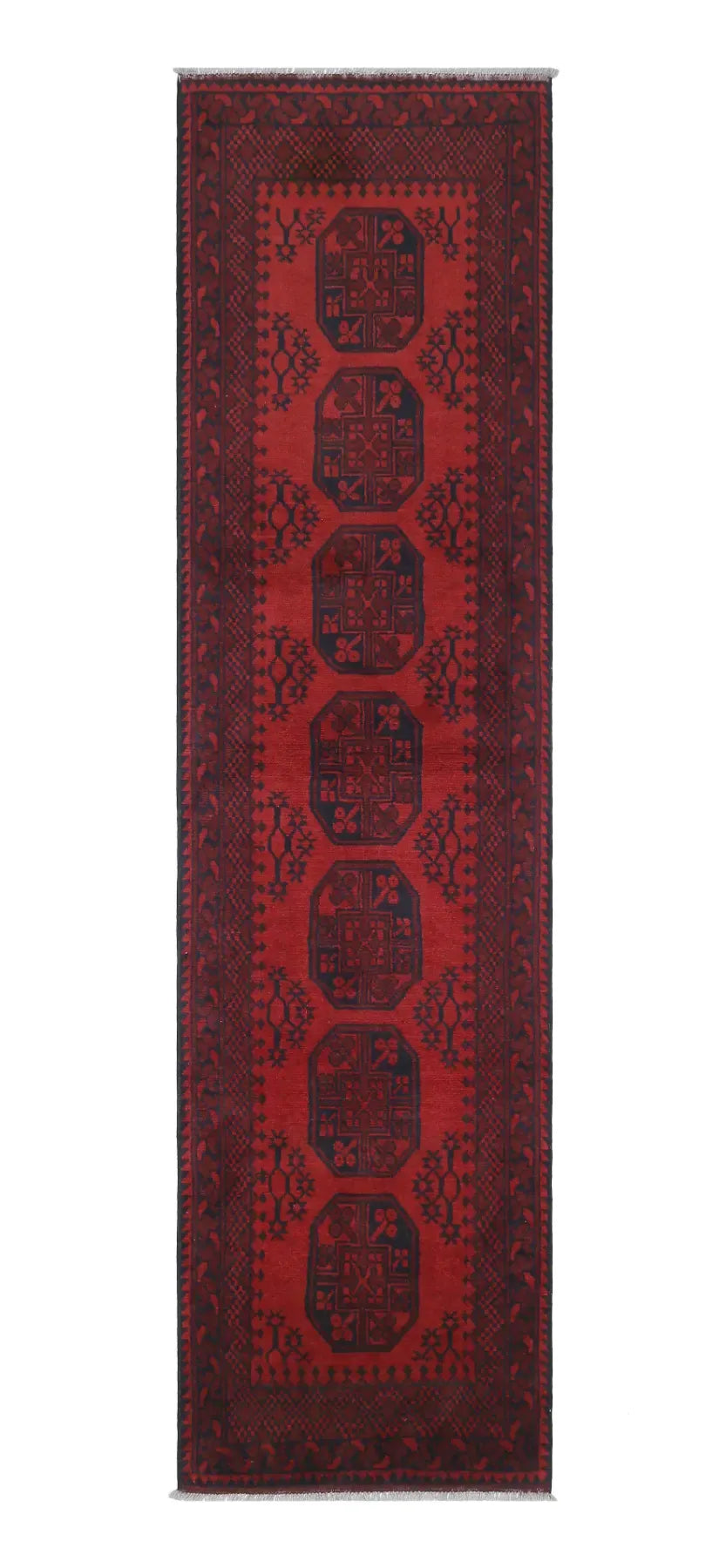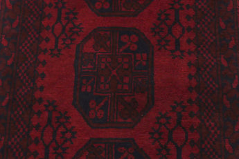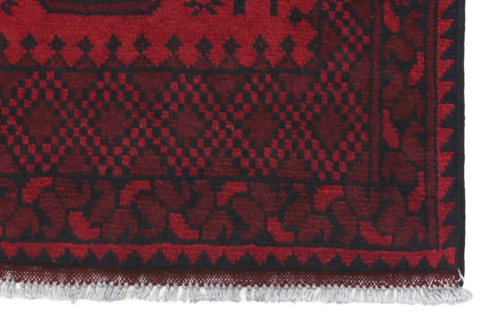 Discover this exquisite hand-knotted Akche rug from Afghanistan, crafted in rich, deep red and black tones that bring warmth and elegance to any interior. Made from 100% pure wool, including the fringes, it contains no synthetic materials, giving it a naturally soft, durable, and authentic feel. The traditional “elephant foot” motif, characteristic of Akche rugs, adds a timeless and culturally rich expression. A perfect choice for anyone seeking a rug that unites craftsmanship, character, and classic oriental beauty.