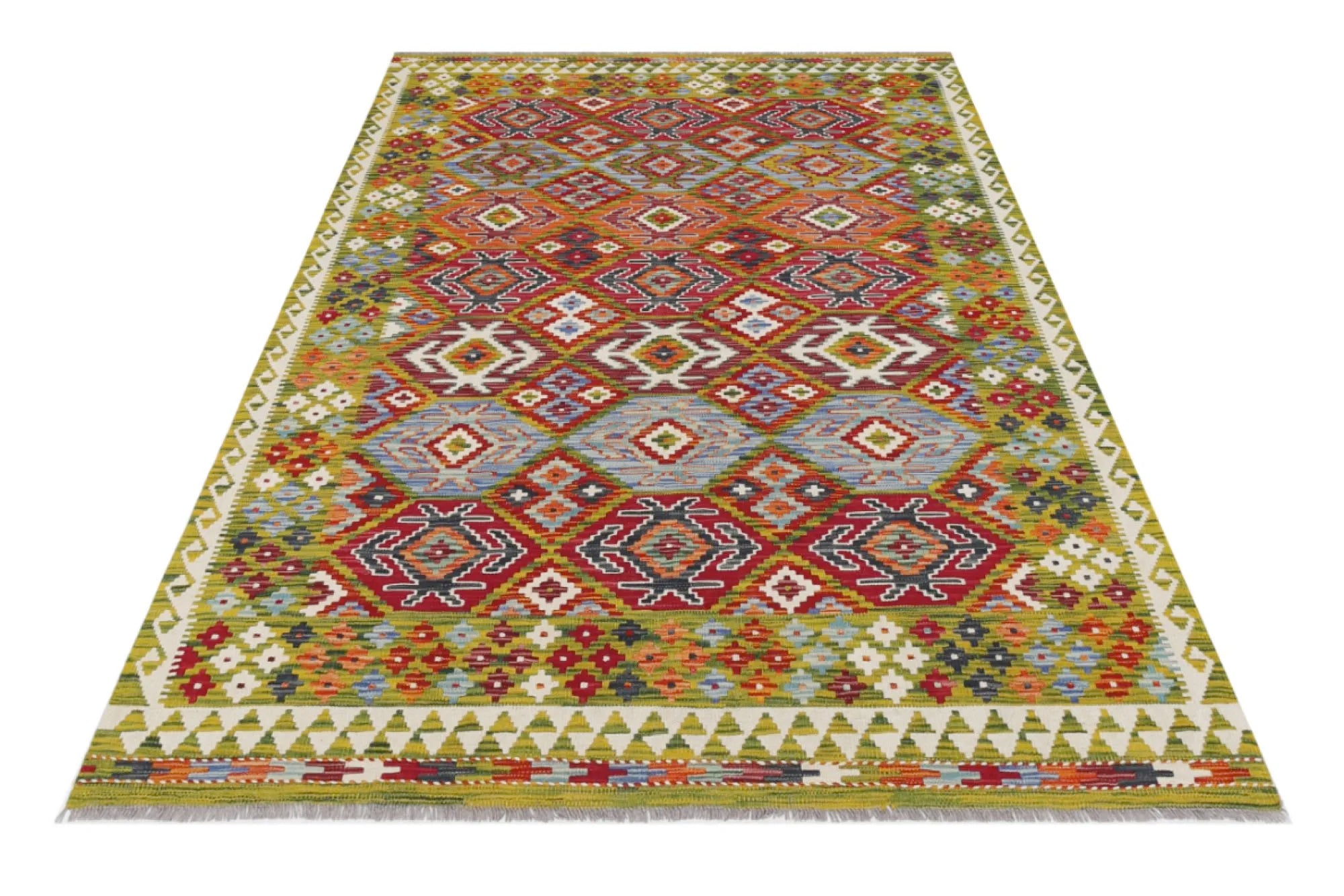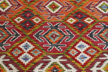 A Masterpiece of Afghan Craftsmanship with Caucasian Inspiration. Kelim Chobi rugs are a brilliant e x ample of traditional Afghan craftsmanship, combining both quality and aesthetic finesse. These rugs are uniquely handwoven in Afghanistan and carry a rich history of craftsmanship, where traditional techniques have been passed down through generations. What makes Kelim Chobi rugs particularly remarkable is their distinct design, heavily influenced by Caucasian patterns. The geometric shapes and symmetrical patterns, typical of Caucasian rugs, give Kelim Chobi rugs their unique and timeless character. The colors used in Kelim Chobi rugs are often subdued and natural, providing them with an elegant and sophisticated look. These colors are derived from natural dyes, which not only provide a durable and authentic color palette but also reflect a deep respect for nature and traditional methods. Each Kelim Chobi rug is handwoven with the utmost care and precision, ensuring high quality and durability. The rugs are flat-woven, giving them a smooth surface and making them both practical and easy to maintain. Thanks to their combination of Afghan craftsmanship and Caucasian design, Kelim Chobi rugs are a popular choice for those looking for a beautiful and timeless decorative element that can enhance any room. These rugs are not only practical floor coverings but also artworks that tell a story of tradition and culture. If you are looking for a rug that combines traditional craftsmanship with stylish design, Kelim Chobi rugs are an e x cellent choice. Their timeless beauty and durable quality make them a perfect investment for your home.