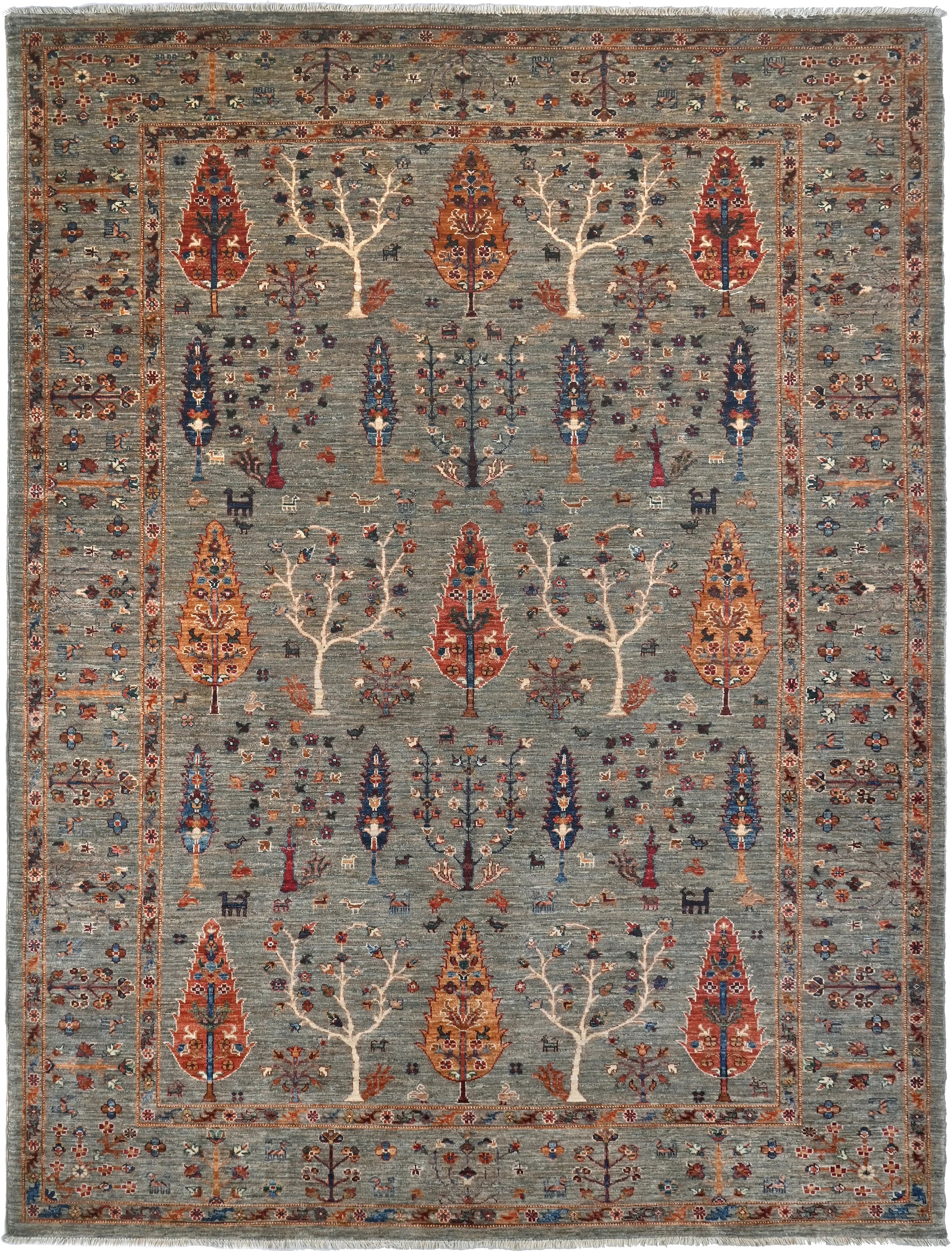 Gran is an exclusive, hand-knotted Khorjin-style rug from Afghanistan, featuring a design inspired by the organic patterns of pine wood grains. The bright, cheerful colors combined with the artistic composition make this rug ideal for anyone looking for a vibrant, modern and expressive interior piece. Made from 100% hand-spun wool and dyed entirely with natural vegetable dyes, this rug offers a warm, authentic look with a beautiful natural sheen. Every knot is tied by hand by skilled Afghan artisans, ensuring a dense, durable and long-lasting rug of superior quality. The Gran rug fits perfectly in modern and classic interiors alike and serves beautifully as a statement piece in living rooms, bedrooms or workspaces. A stunning blend of traditional craftsmanship and contemporary design — for those who want a rug that truly stands out.