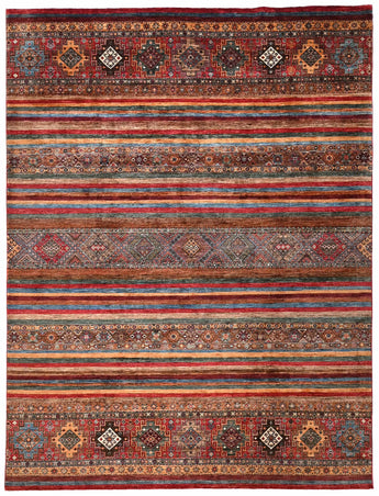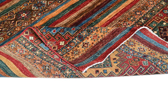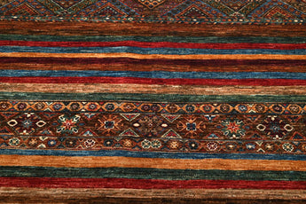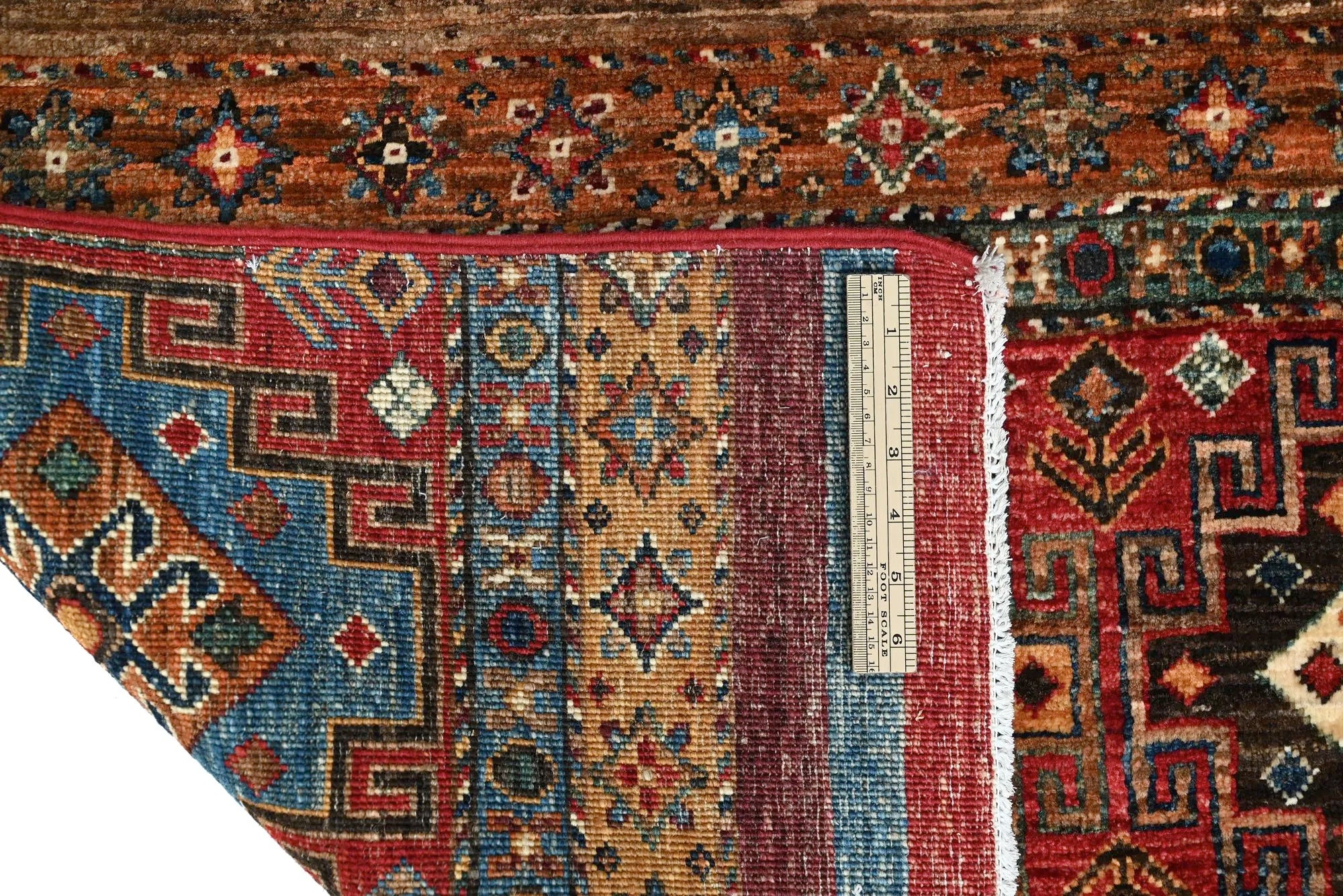 Khorjin rugs from Afghanistan are a type of traditional te x tile often used as bags or saddlebags by nomadic tribes in the region. These rugs are known for their practical uses and beautiful patterns. Originally created to be used as pack bags by nomadic people, Khorjin rugs are often designed with functionality in mind. The patterns on Khorjin rugs are often geometric and colorful, with symbolic motifs representing the tribe's culture and traditions. Common motifs include diamonds, rhombuses, and other geometric shapes, often in a rich color palette. Khorjin rugs are typically woven from wool, which makes them durable and tough enough for nomadic life. The colors in Khorjin rugs are usually natural, produced from plant dyes, giving them a warm and earthy color palette. Typical colors include red, blue, brown, and beige, but there may also be touches of green and yellow. Khorjin rugs are not just practical, but they are also artworks that tell stories about the tribe's life and culture. Each rug is unique and reflects the weaver's skill and creativity. High-quality materials and craftsmanship make Khorjin rugs long-lasting and valuable investments for customers.