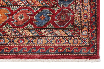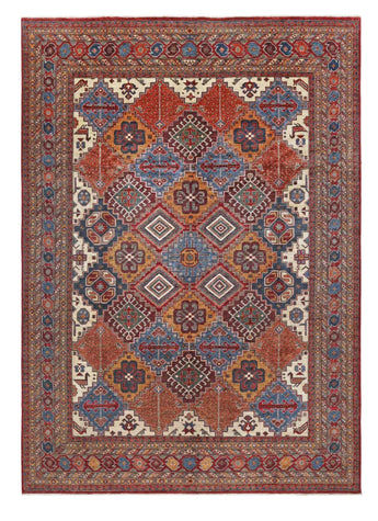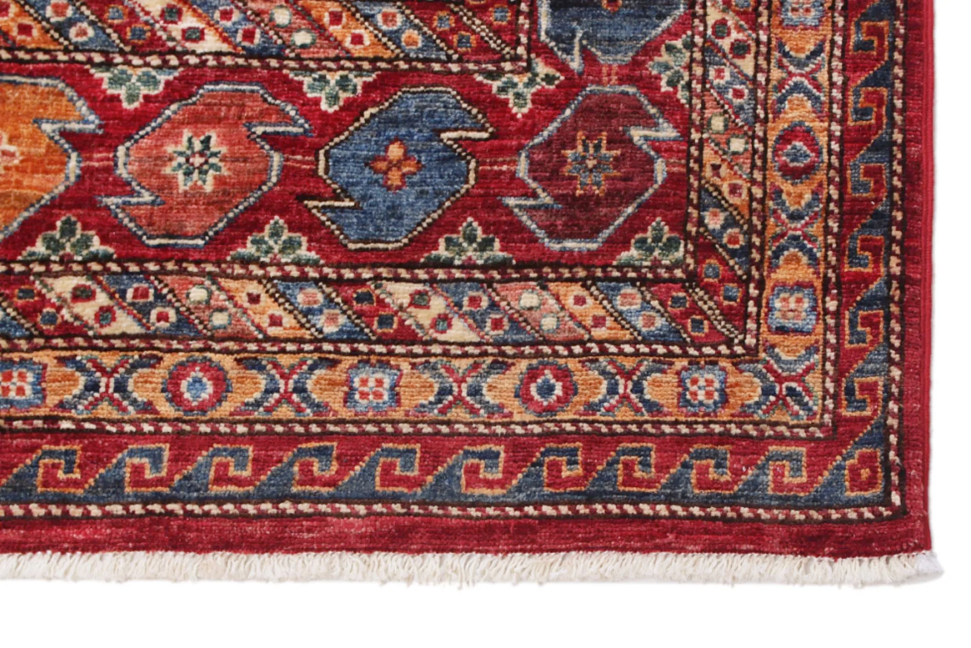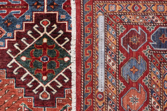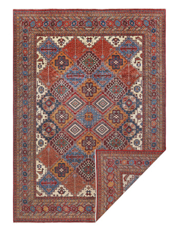 Khorjin rugs from Afghanistan are a type of traditional te x tile often used as bags or saddlebags by nomadic tribes in the region. These rugs are known for their practical uses and beautiful patterns. Originally created to be used as pack bags by nomadic people, Khorjin rugs are often designed with functionality in mind. The patterns on Khorjin rugs are often geometric and colorful, with symbolic motifs representing the tribe's culture and traditions. Common motifs include diamonds, rhombuses, and other geometric shapes, often in a rich color palette. Khorjin rugs are typically woven from wool, which makes them durable and tough enough for nomadic life. The colors in Khorjin rugs are usually natural, produced from plant dyes, giving them a warm and earthy color palette. Typical colors include red, blue, brown, and beige, but there may also be touches of green and yellow. Khorjin rugs are not just practical, but they are also artworks that tell stories about the tribe's life and culture. Each rug is unique and reflects the weaver's skill and creativity. High-quality materials and craftsmanship make Khorjin rugs long-lasting and valuable investments for customers.