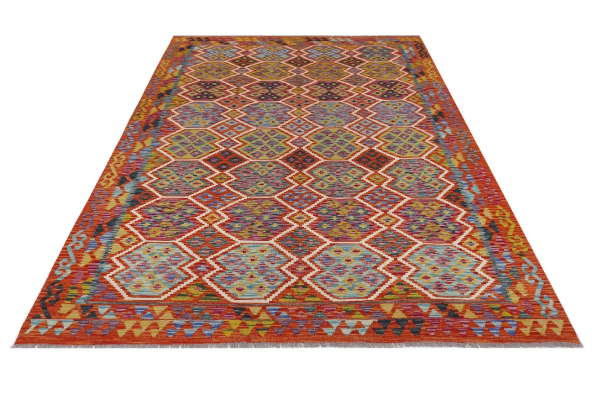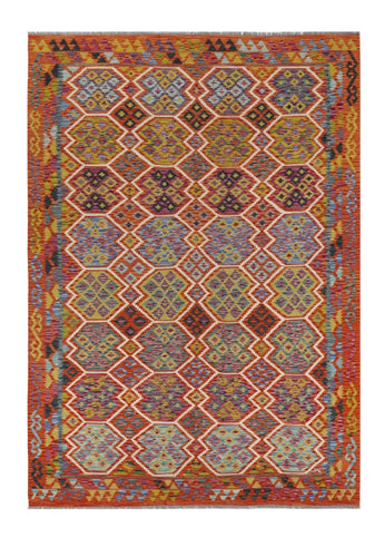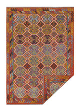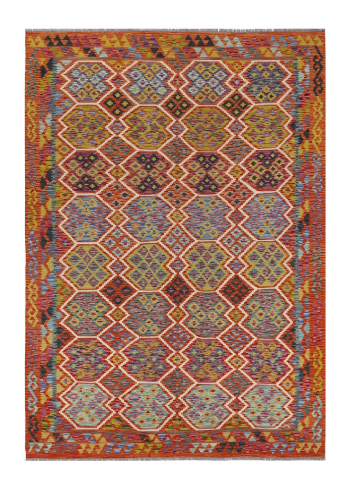 A Masterpiece of Afghan Craftsmanship with Caucasian Inspiration. Kelim Chobi rugs are a brilliant e x ample of traditional Afghan craftsmanship, combining both quality and aesthetic finesse. These rugs are uniquely handwoven in Afghanistan and carry a rich history of craftsmanship, where traditional techniques have been passed down through generations. What makes Kelim Chobi rugs particularly remarkable is their distinct design, heavily influenced by Caucasian patterns. The geometric shapes and symmetrical patterns, typical of Caucasian rugs, give Kelim Chobi rugs their unique and timeless character. The colors used in Kelim Chobi rugs are often subdued and natural, providing them with an elegant and sophisticated look. These colors are derived from natural dyes, which not only provide a durable and authentic color palette but also reflect a deep respect for nature and traditional methods. Each Kelim Chobi rug is handwoven with the utmost care and precision, ensuring high quality and durability. The rugs are flat-woven, giving them a smooth surface and making them both practical and easy to maintain. Thanks to their combination of Afghan craftsmanship and Caucasian design, Kelim Chobi rugs are a popular choice for those looking for a beautiful and timeless decorative element that can enhance any room. These rugs are not only practical floor coverings but also artworks that tell a story of tradition and culture. If you are looking for a rug that combines traditional craftsmanship with stylish design, Kelim Chobi rugs are an e x cellent choice. Their timeless beauty and durable quality make them a perfect investment for your home.