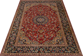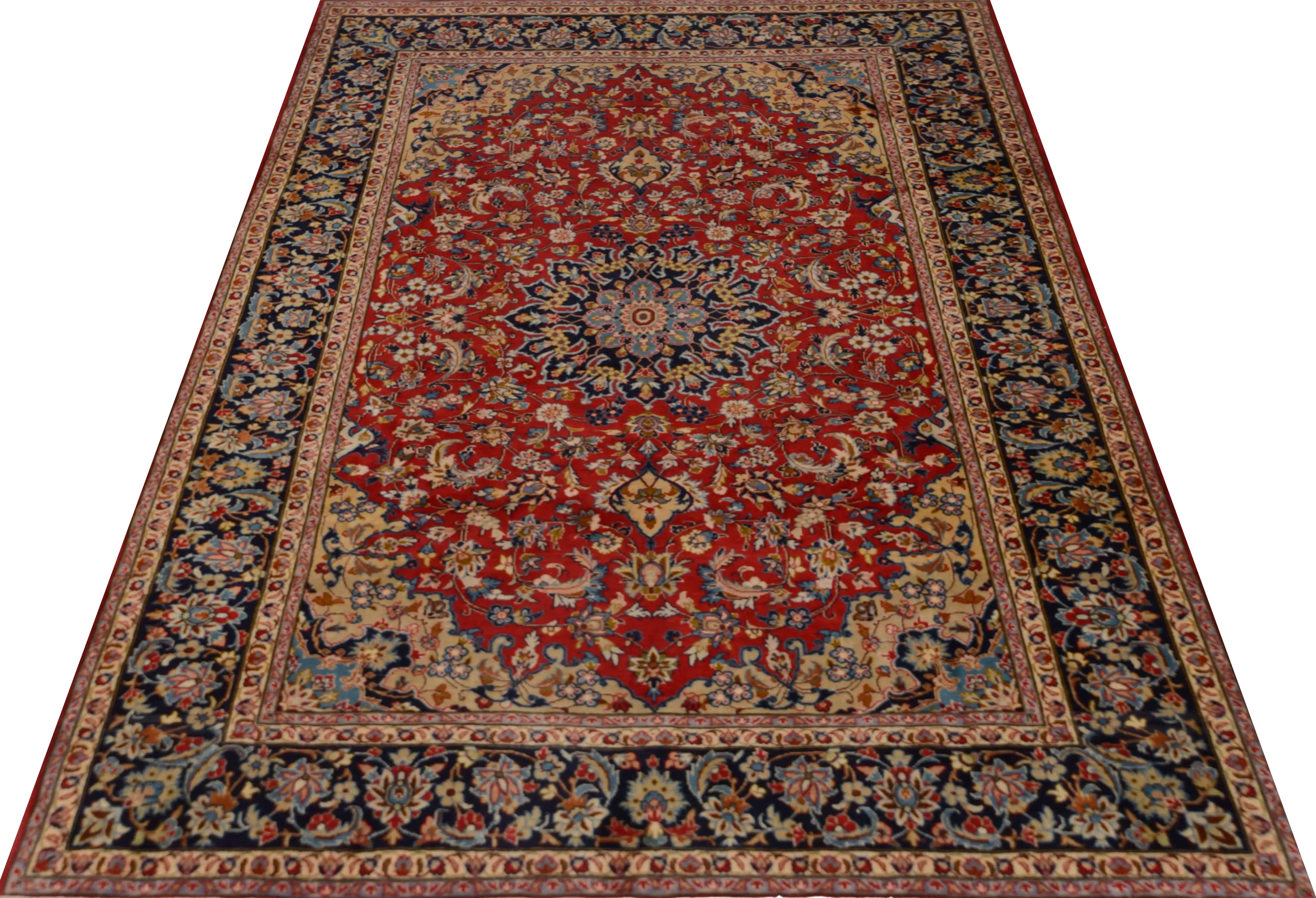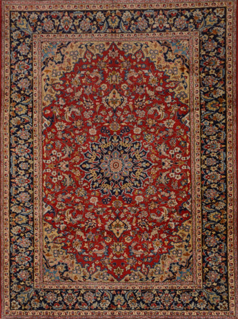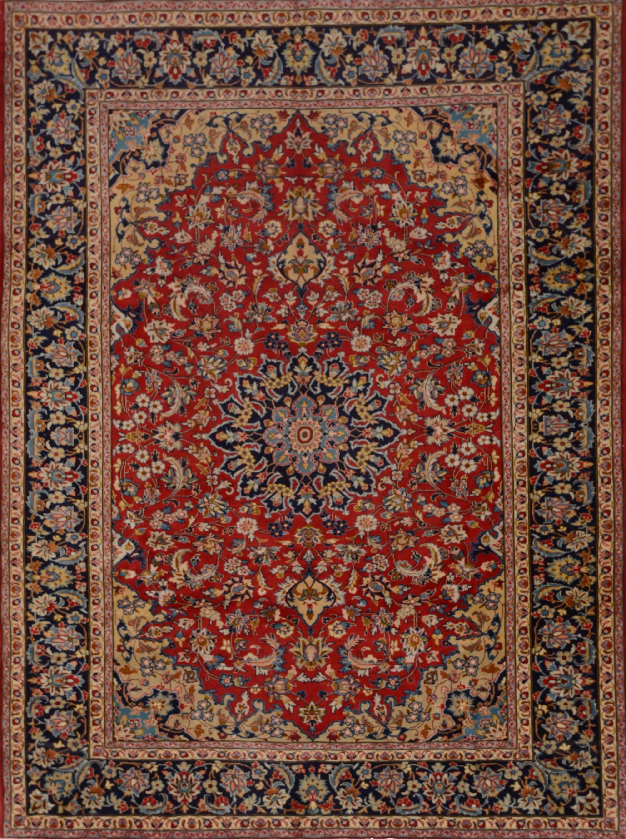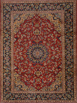 Najafabad rugs are hand-knotted rugs made in the city of Najafabad, located in the Isfahan province of Persia. These rugs are known for their high quality and beauty, and they have a long tradition of craftsmanship that dates back several centuries. Typically woven from the finest wool, these rugs feature a soft and lint-free surface. Sometimes, they may also contain silk threads to highlight patterns and add e x tra sheen to the rug. The production of Najafabad rugs involves a meticulous hand-knotting technique characteristic of the Iranian rug industry. The rugs are known for their durability and long-lasting beauty. Typical patterns include geometric shapes, flowers, and medallions, with a color palette often rich in traditional colors such as red, blue, green, and beige. The patterns are usually symmetrical and balanced, adding to their aesthetically pleasing character. Najafabad rugs are celebrated for their elegance and classic Oriental style, making them popular both domestically in Iran and internationally. These rugs are generally medium to large in size and suitable for various settings, including living rooms and formal rooms. They are considered works of art and are highly prized as collectibles due to their craftsmanship and historical value.