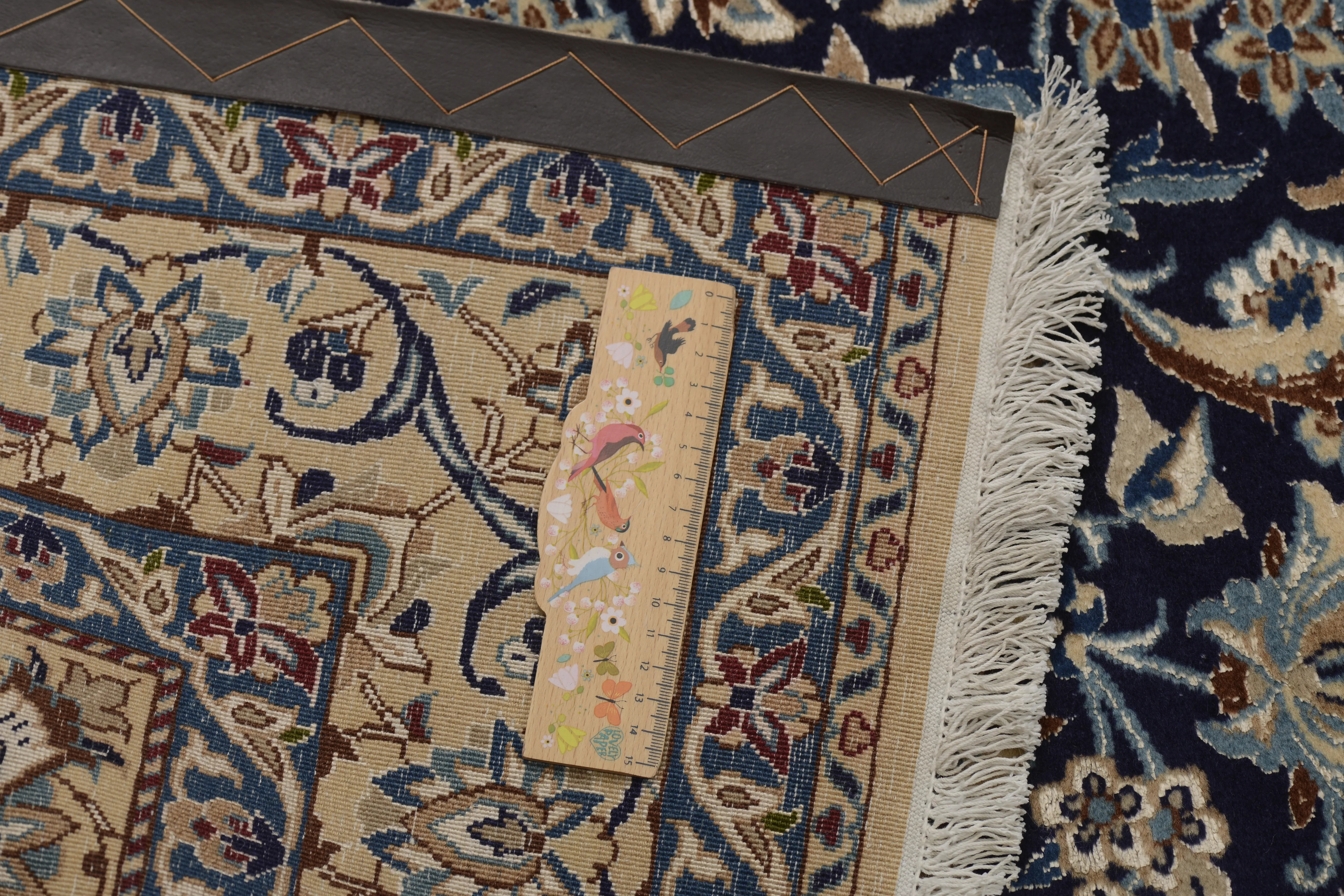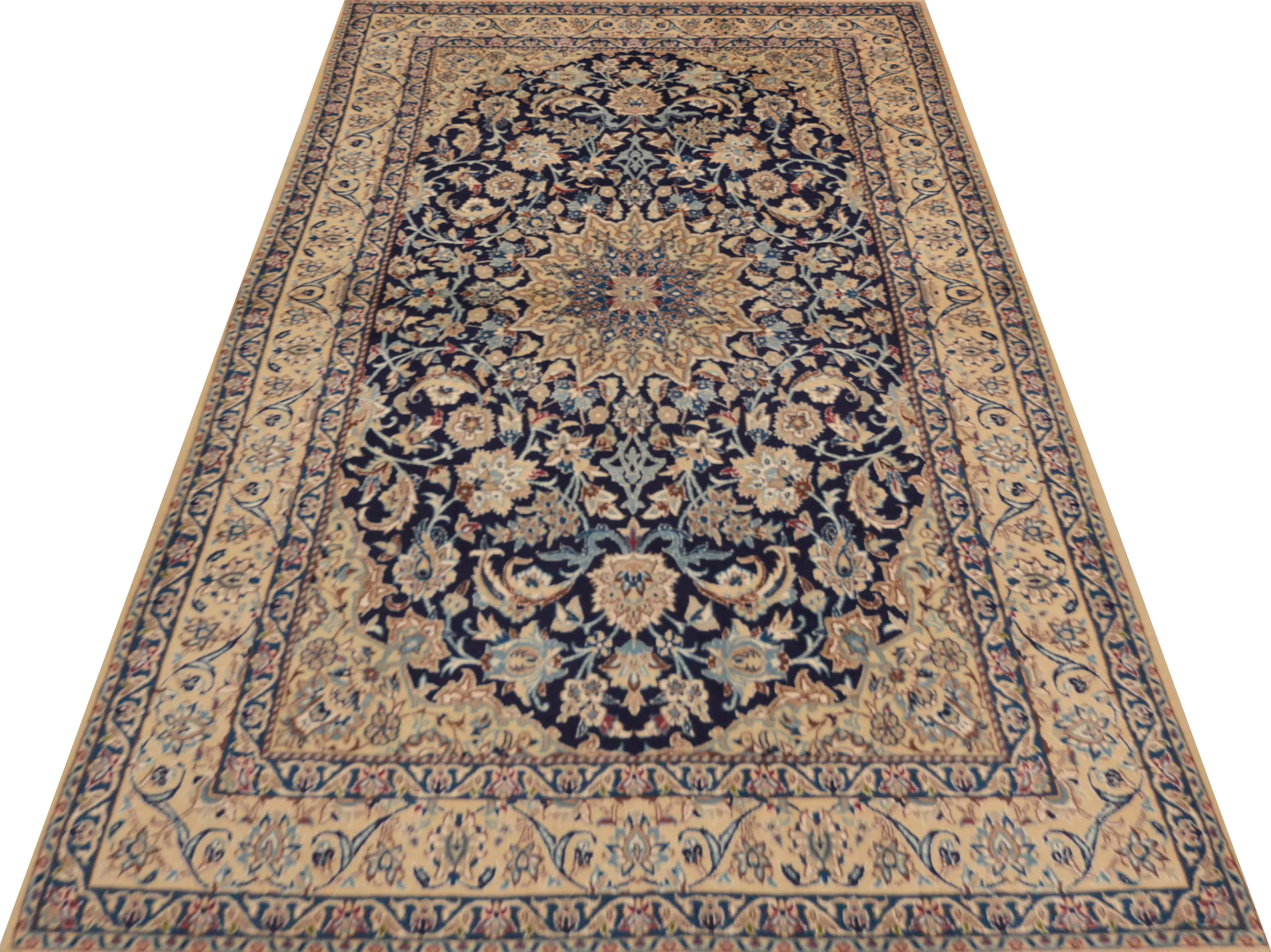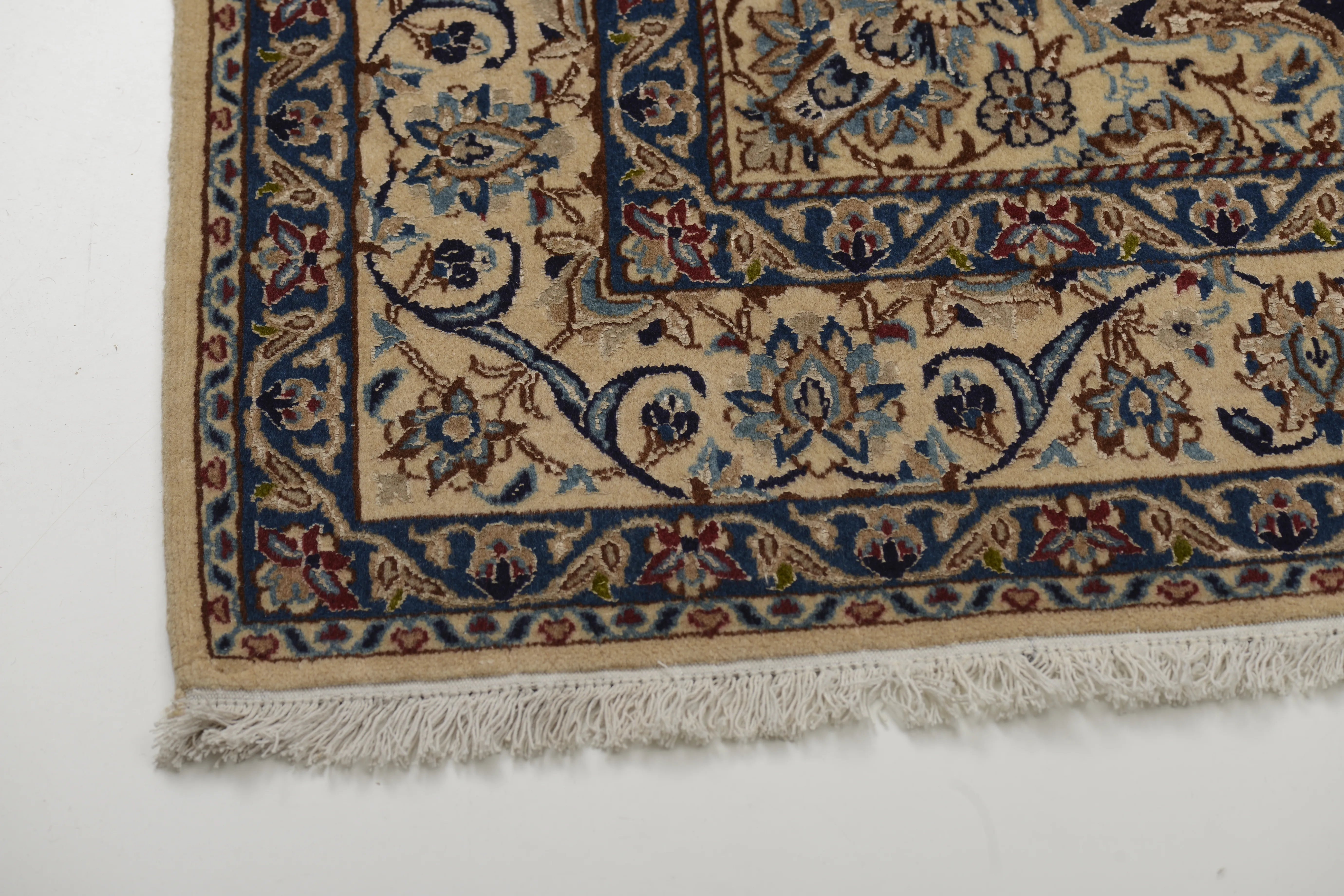 Nain rugs are hand-knotted rugs made in the city of Nain (or Na'in) and its surrounding areas in the central Persian province of Isfahan. These rugs are celebrated for their high quality, fine craftsmanship, and elegant design. Typically made from the finest wool yarn, Nain rugs feature a soft and lint-free surface. Some may also contain silk threads, especially in the pattern details or to add e x tra sheen to the rug. The production of Nain rugs is a slow and detailed process carried out by skilled artisans. The hand-knotting technique is central to creating the rugs’ comple x patterns and high quality. Typical patterns include flowers, arabesques, medallions, and geometric shapes. The design is often intricate and symmetrical, giving the rugs a distinct aesthetic character. The color palette for Nain rugs is usually subtle and sophisticated, with shades of ivory, blue, gray, and beige. The light and bright colors contribute to creating a sense of elegance and airiness in the rugs. Nain rugs are known for their elegance and classic Oriental style. Their fine craftsmanship and subtle patterns make them a popular choice for both traditional and modern home environments. These rugs are usually medium to small in size and suitable for various uses, including living rooms, bedrooms, and dining areas. On the international rug market, Nain rugs are highly sought after for their high quality, skilled craftsmanship, and elegant design.