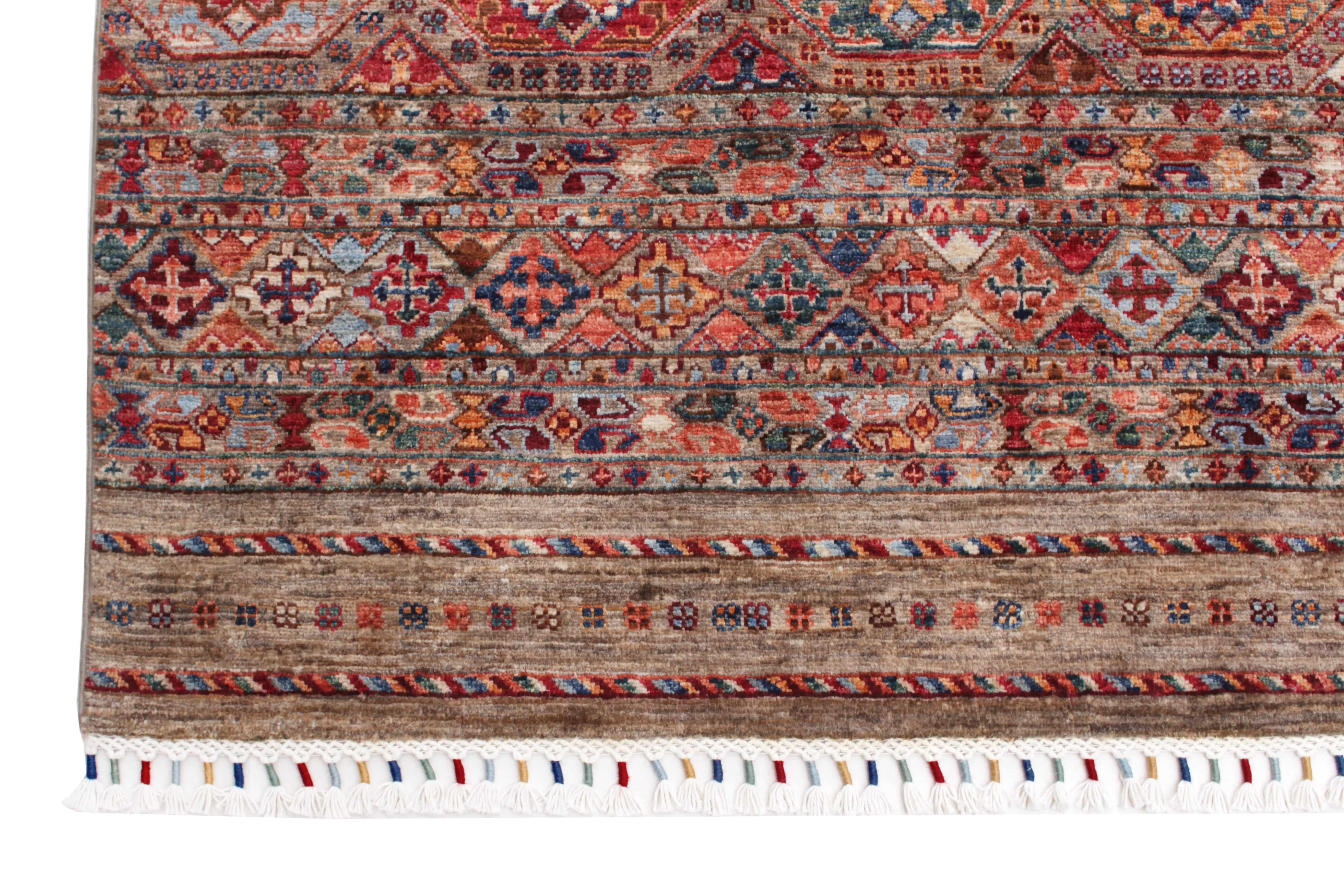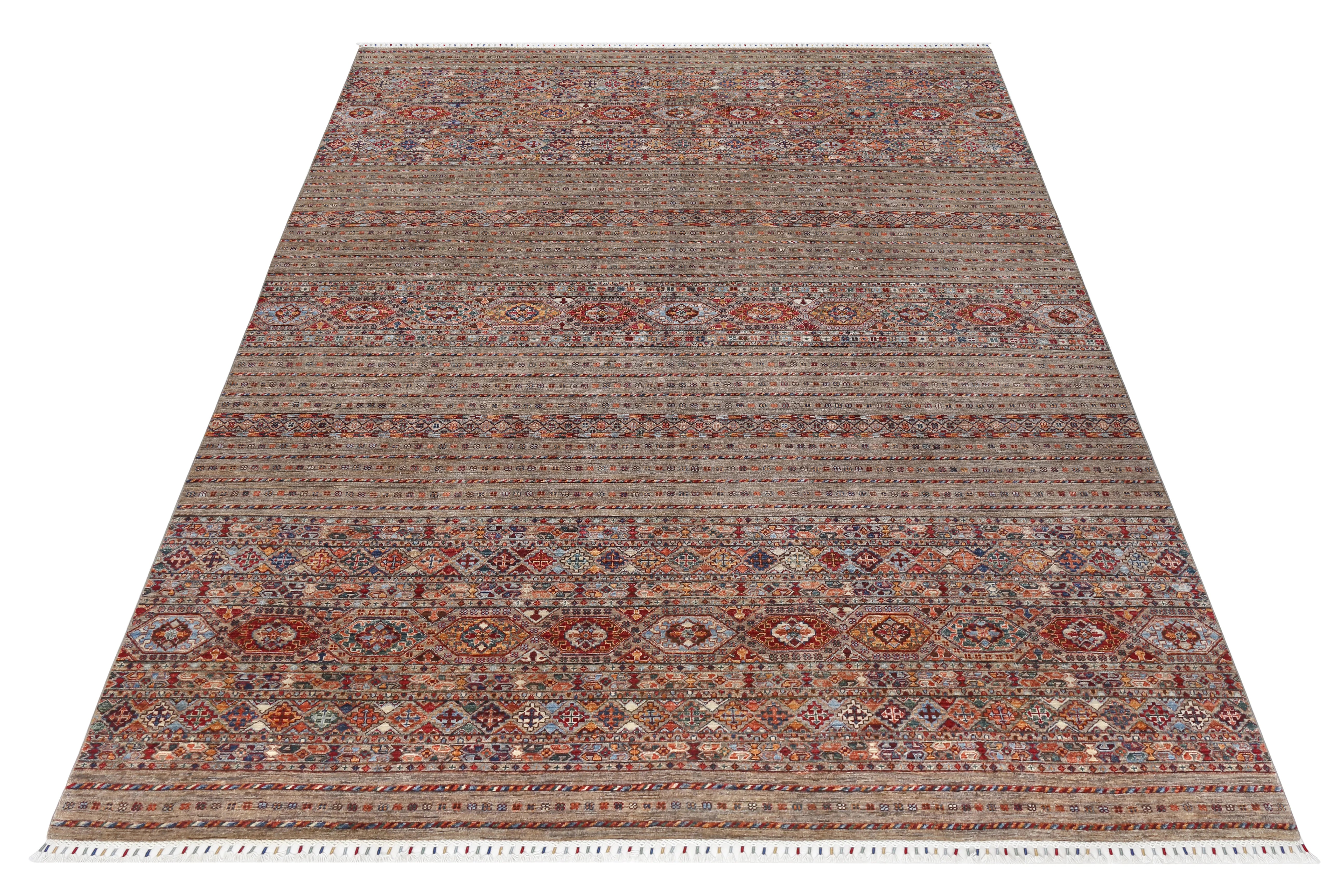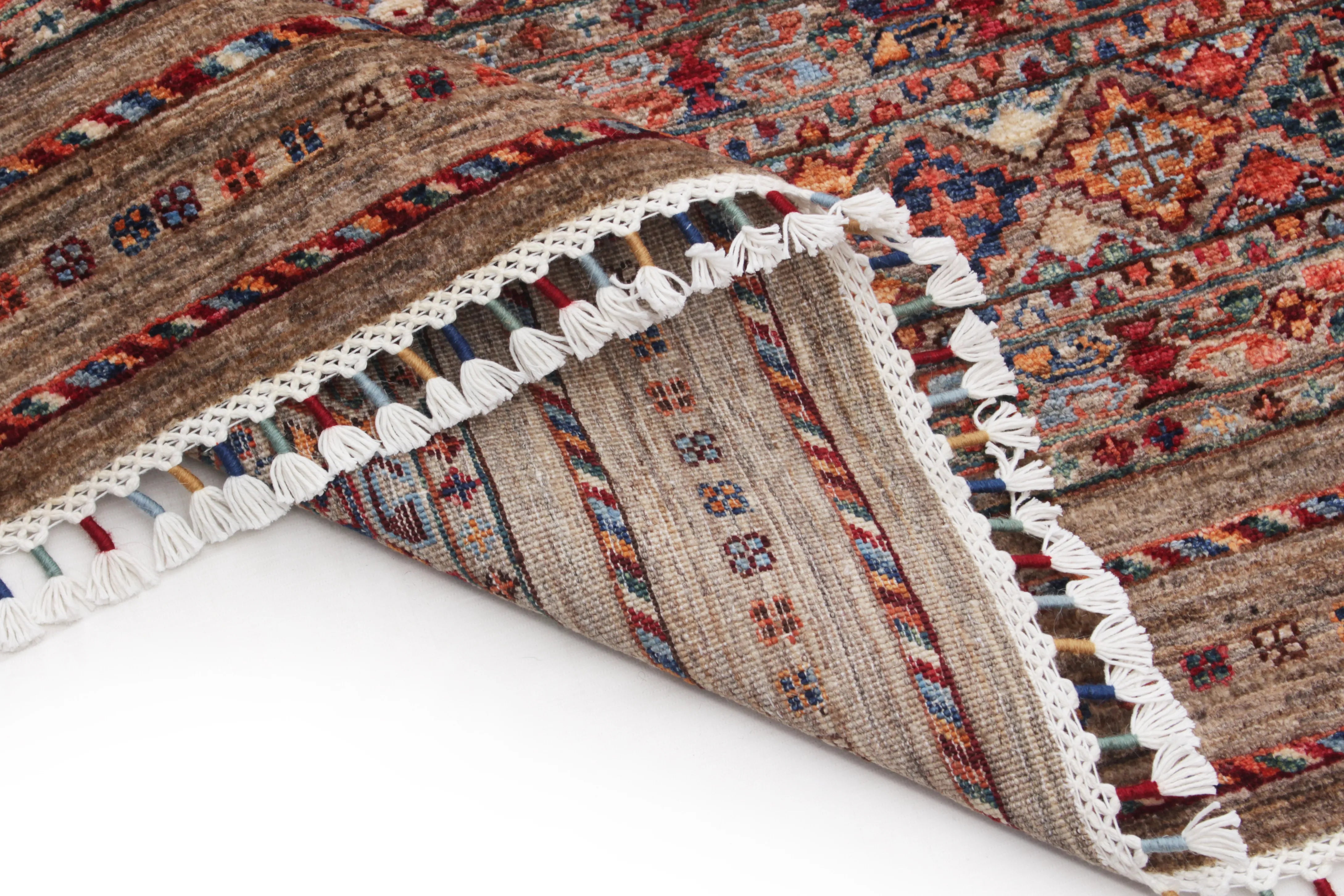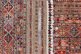 Khorjin rugs from Afghanistan are a type of traditional te x tile often used as bags or saddlebags by nomadic tribes in the region. These rugs are known for their practical uses and beautiful patterns. Originally created to be used as pack bags by nomadic people, Khorjin rugs are often designed with functionality in mind. The patterns on Khorjin rugs are often geometric and colorful, with symbolic motifs representing the tribe's culture and traditions. Common motifs include diamonds, rhombuses, and other geometric shapes, often in a rich color palette. Khorjin rugs are typically woven from wool, which makes them durable and tough enough for nomadic life. The colors in Khorjin rugs are usually natural, produced from plant dyes, giving them a warm and earthy color palette. Typical colors include red, blue, brown, and beige, but there may also be touches of green and yellow. Khorjin rugs are not just practical, but they are also artworks that tell stories about the tribe's life and culture. Each rug is unique and reflects the weaver's skill and creativity. High-quality materials and craftsmanship make Khorjin rugs long-lasting and valuable investments for customers.