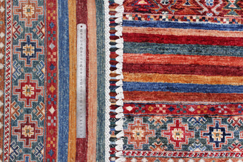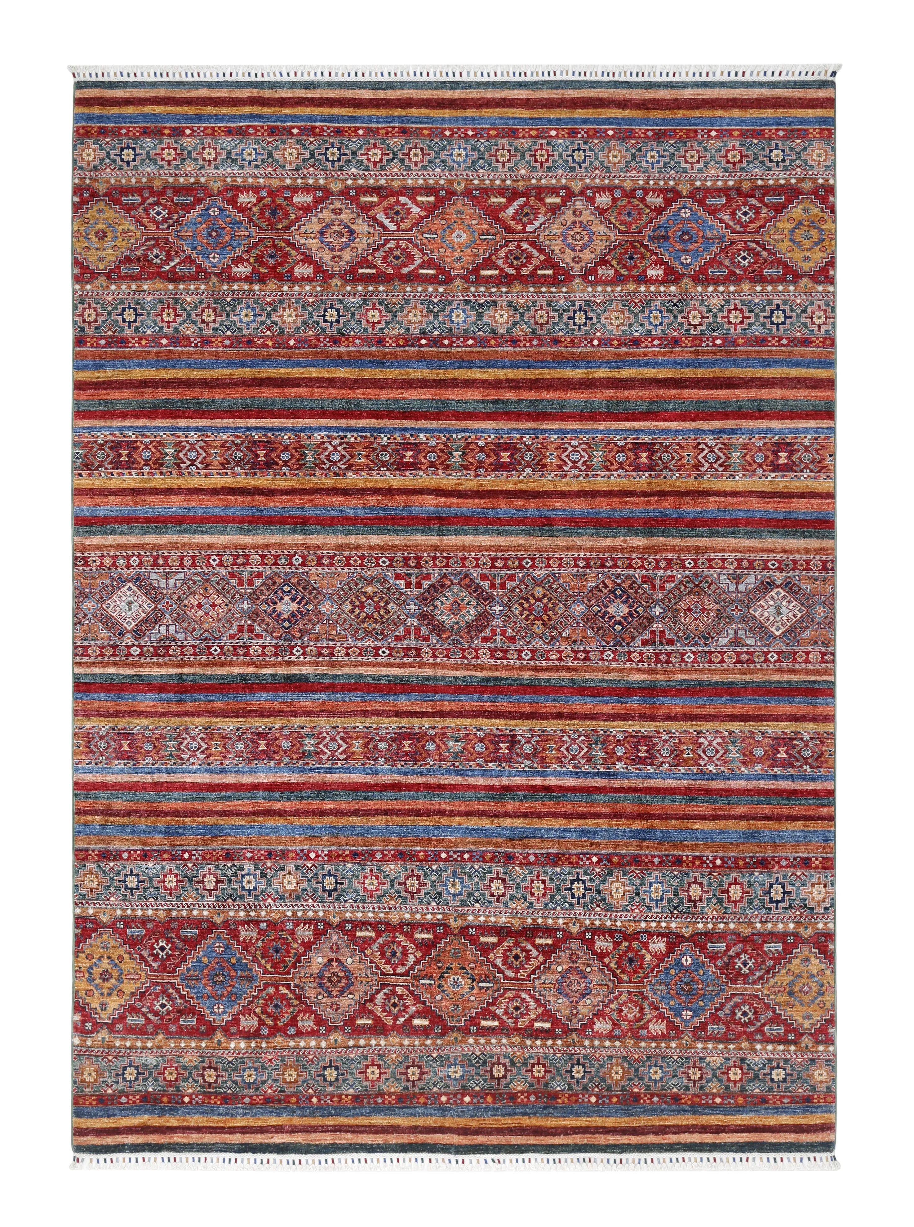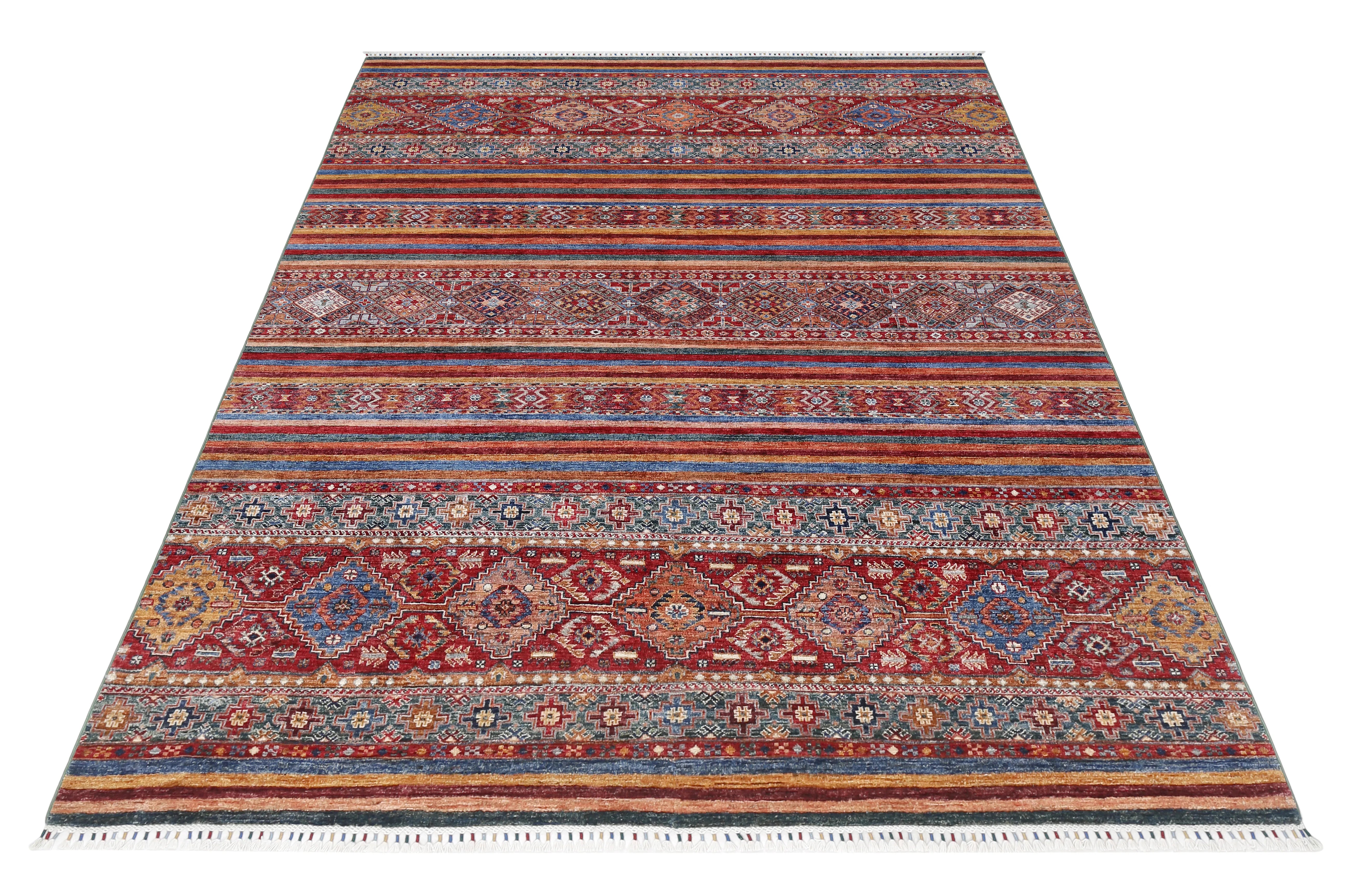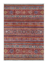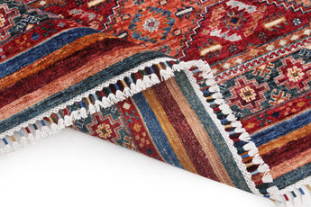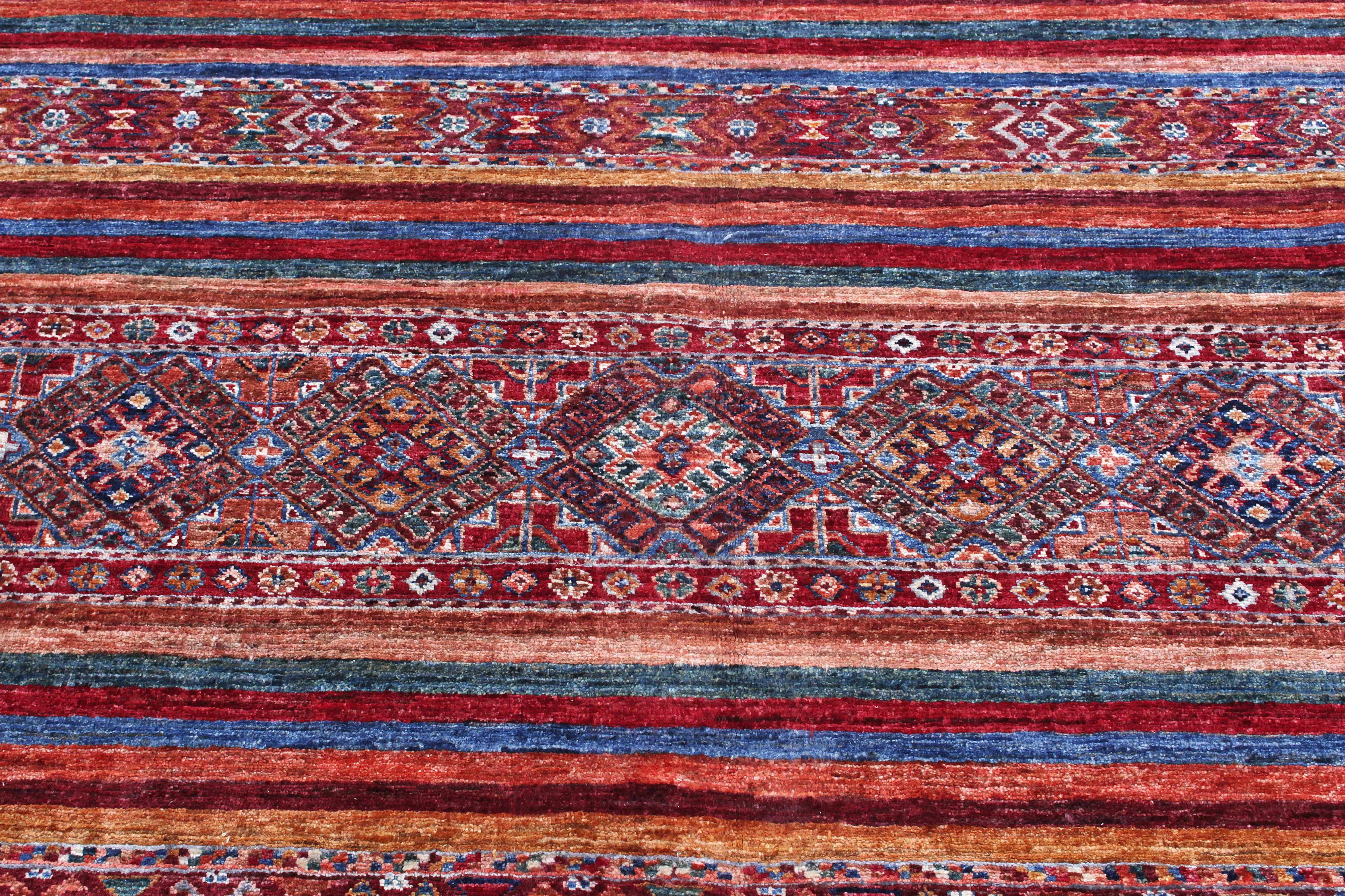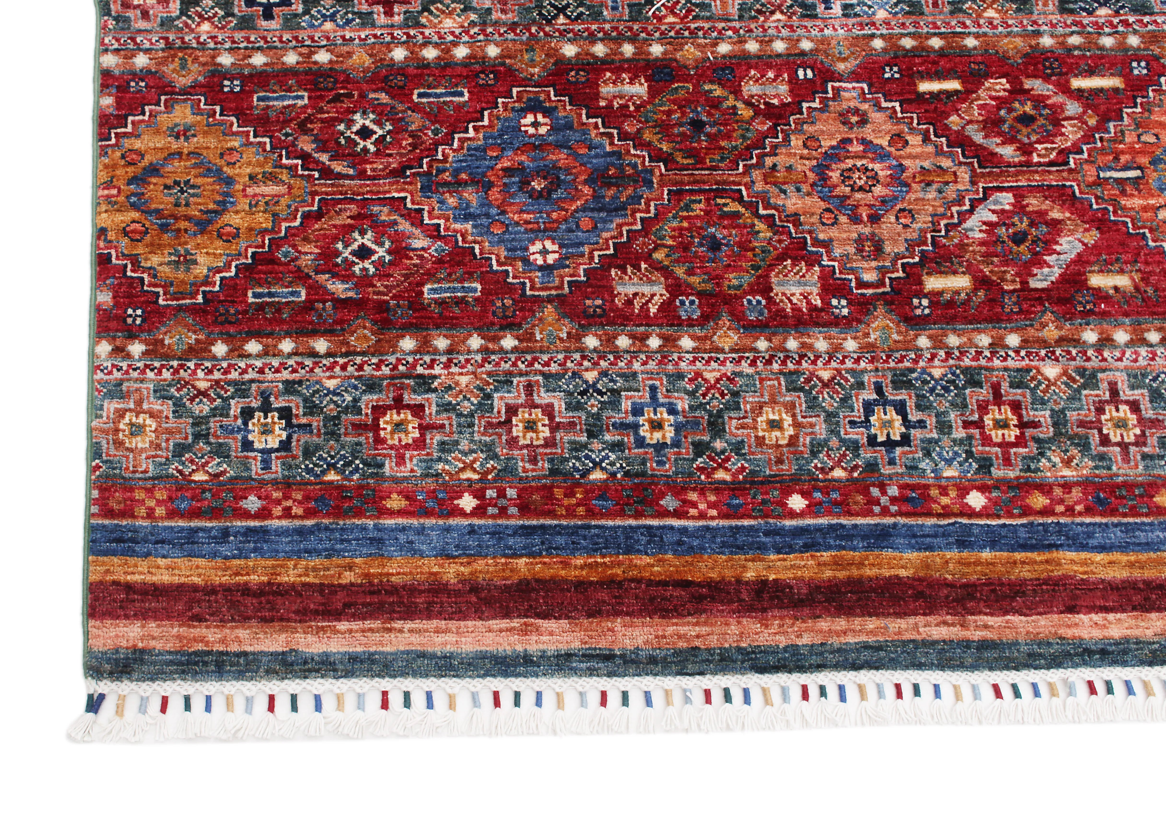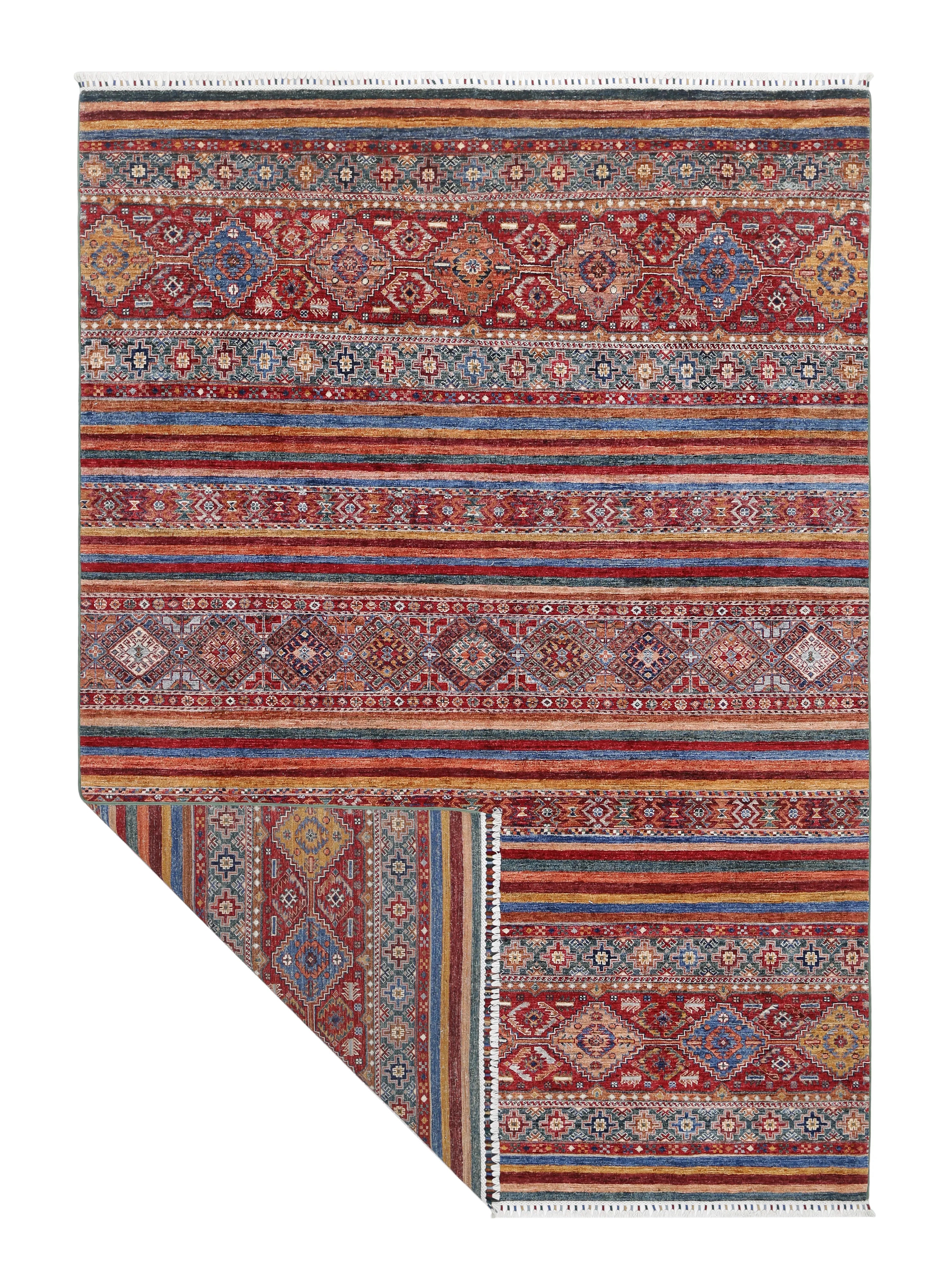 Khorjin rugs from Afghanistan are a type of traditional te x tile often used as bags or saddlebags by nomadic tribes in the region. These rugs are known for their practical uses and beautiful patterns. Originally created to be used as pack bags by nomadic people, Khorjin rugs are often designed with functionality in mind. The patterns on Khorjin rugs are often geometric and colorful, with symbolic motifs representing the tribe's culture and traditions. Common motifs include diamonds, rhombuses, and other geometric shapes, often in a rich color palette. Khorjin rugs are typically woven from wool, which makes them durable and tough enough for nomadic life. The colors in Khorjin rugs are usually natural, produced from plant dyes, giving them a warm and earthy color palette. Typical colors include red, blue, brown, and beige, but there may also be touches of green and yellow. Khorjin rugs are not just practical, but they are also artworks that tell stories about the tribe's life and culture. Each rug is unique and reflects the weaver's skill and creativity. High-quality materials and craftsmanship make Khorjin rugs long-lasting and valuable investments for customers.