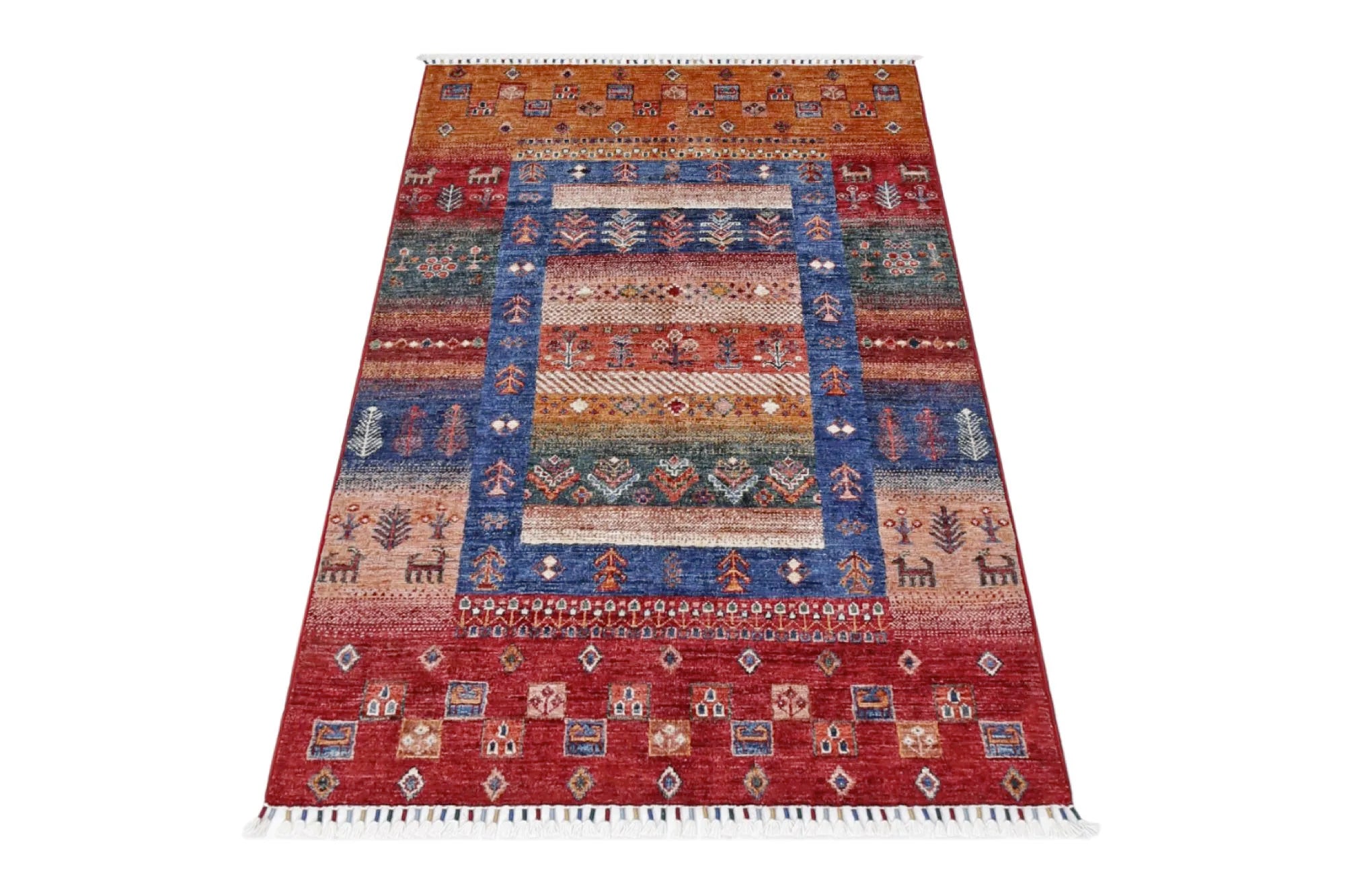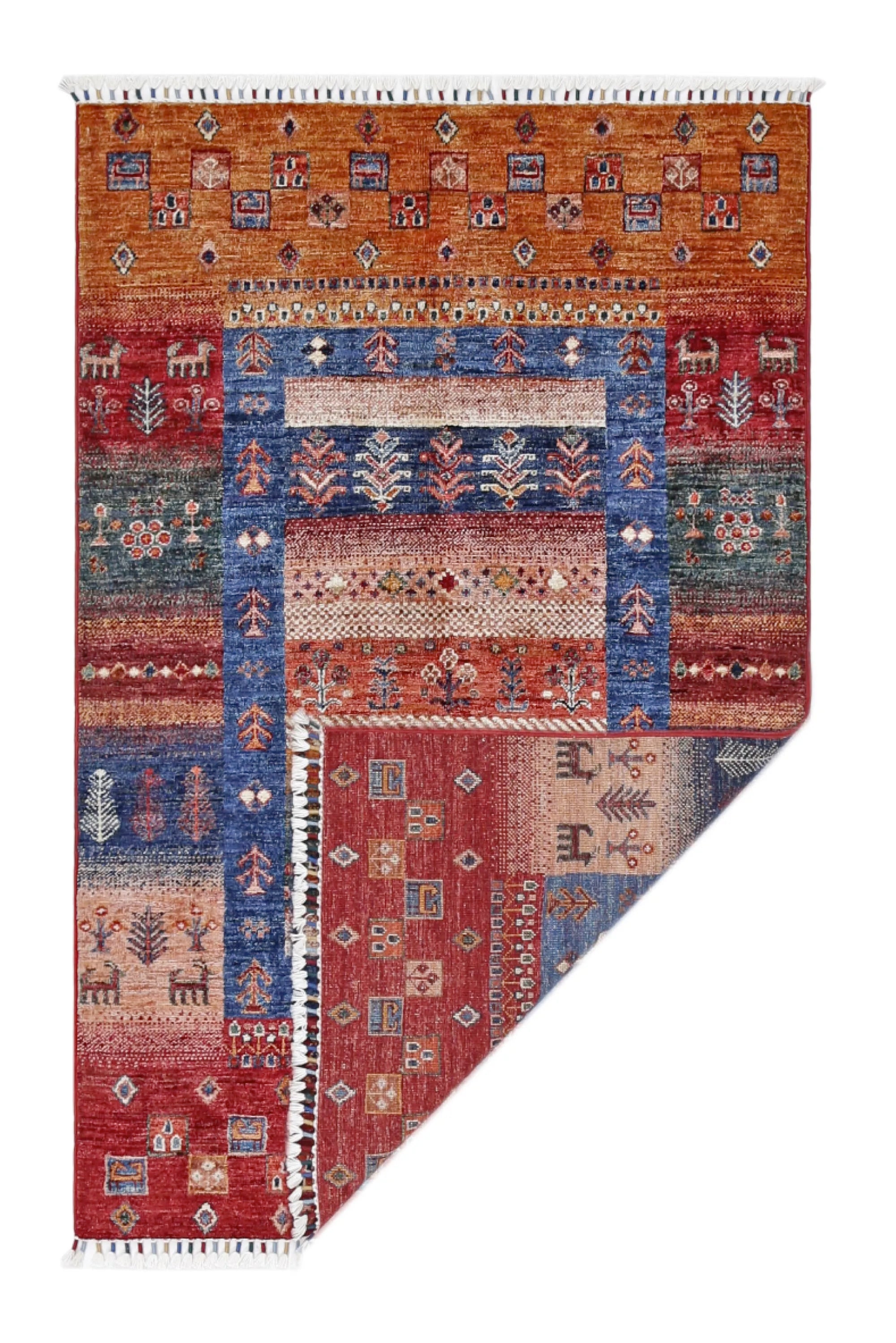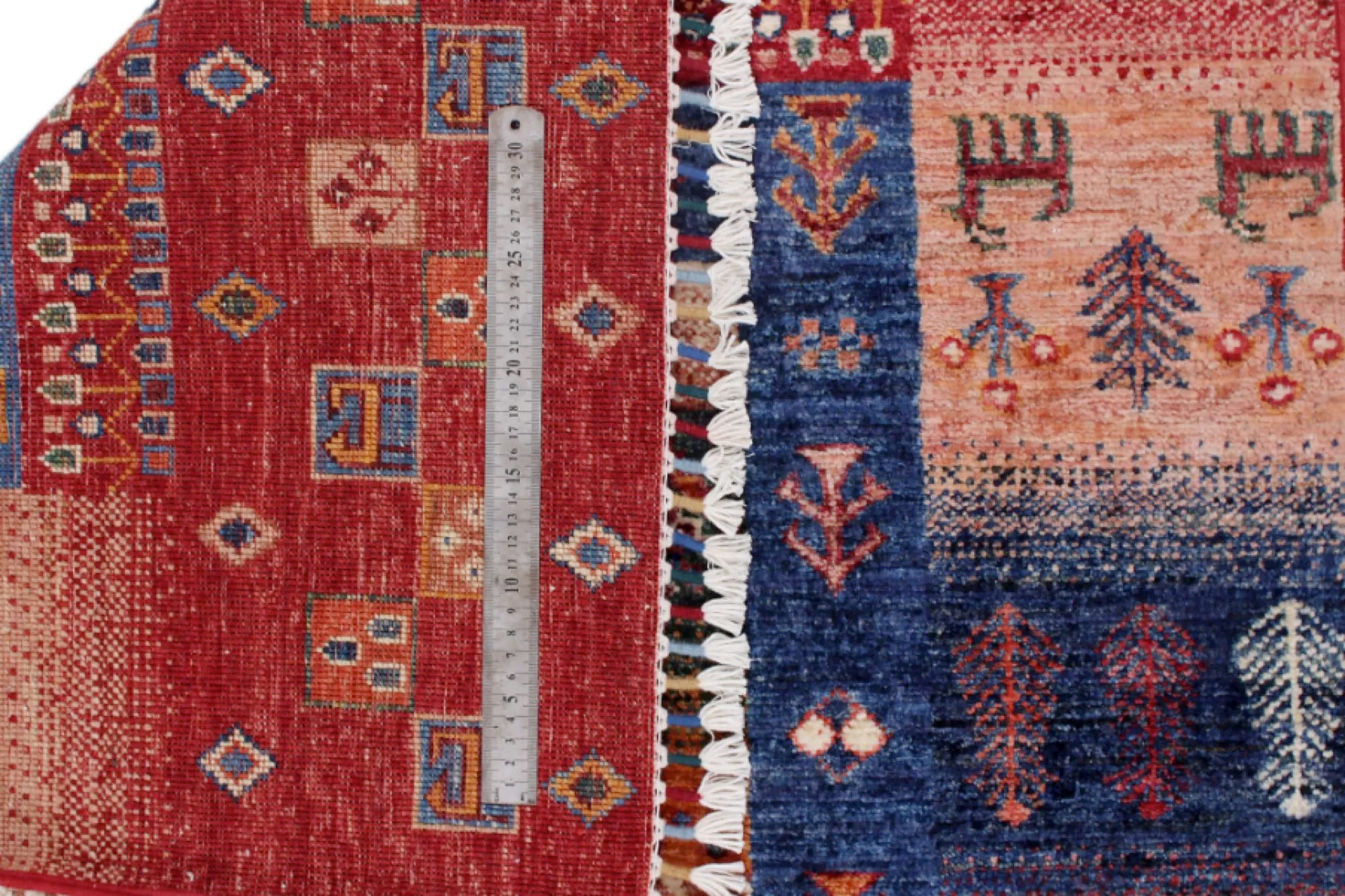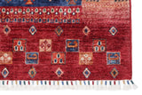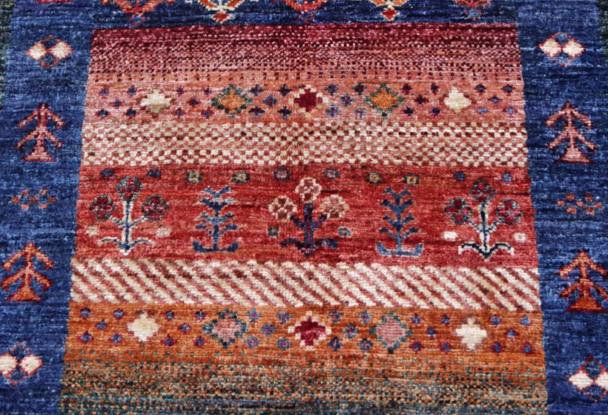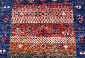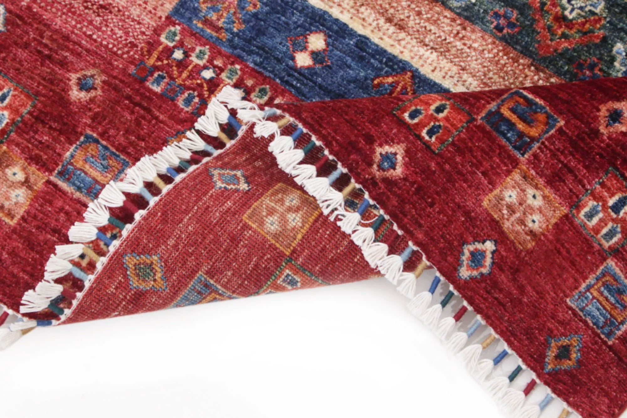 Khorjin rugs from Afghanistan are a type of traditional te x tile often used as bags or saddlebags by nomadic tribes in the region. These rugs are known for their practical uses and beautiful patterns. Originally created to be used as pack bags by nomadic people, Khorjin rugs are often designed with functionality in mind. The patterns on Khorjin rugs are often geometric and colorful, with symbolic motifs representing the tribe's culture and traditions. Common motifs include diamonds, rhombuses, and other geometric shapes, often in a rich color palette. Khorjin rugs are typically woven from wool, which makes them durable and tough enough for nomadic life. The colors in Khorjin rugs are usually natural, produced from plant dyes, giving them a warm and earthy color palette. Typical colors include red, blue, brown, and beige, but there may also be touches of green and yellow. Khorjin rugs are not just practical, but they are also artworks that tell stories about the tribe's life and culture. Each rug is unique and reflects the weaver's skill and creativity. High-quality materials and craftsmanship make Khorjin rugs long-lasting and valuable investments for customers.