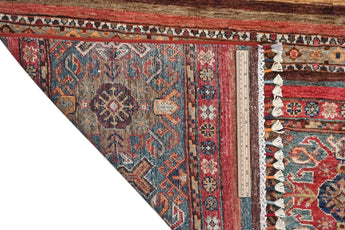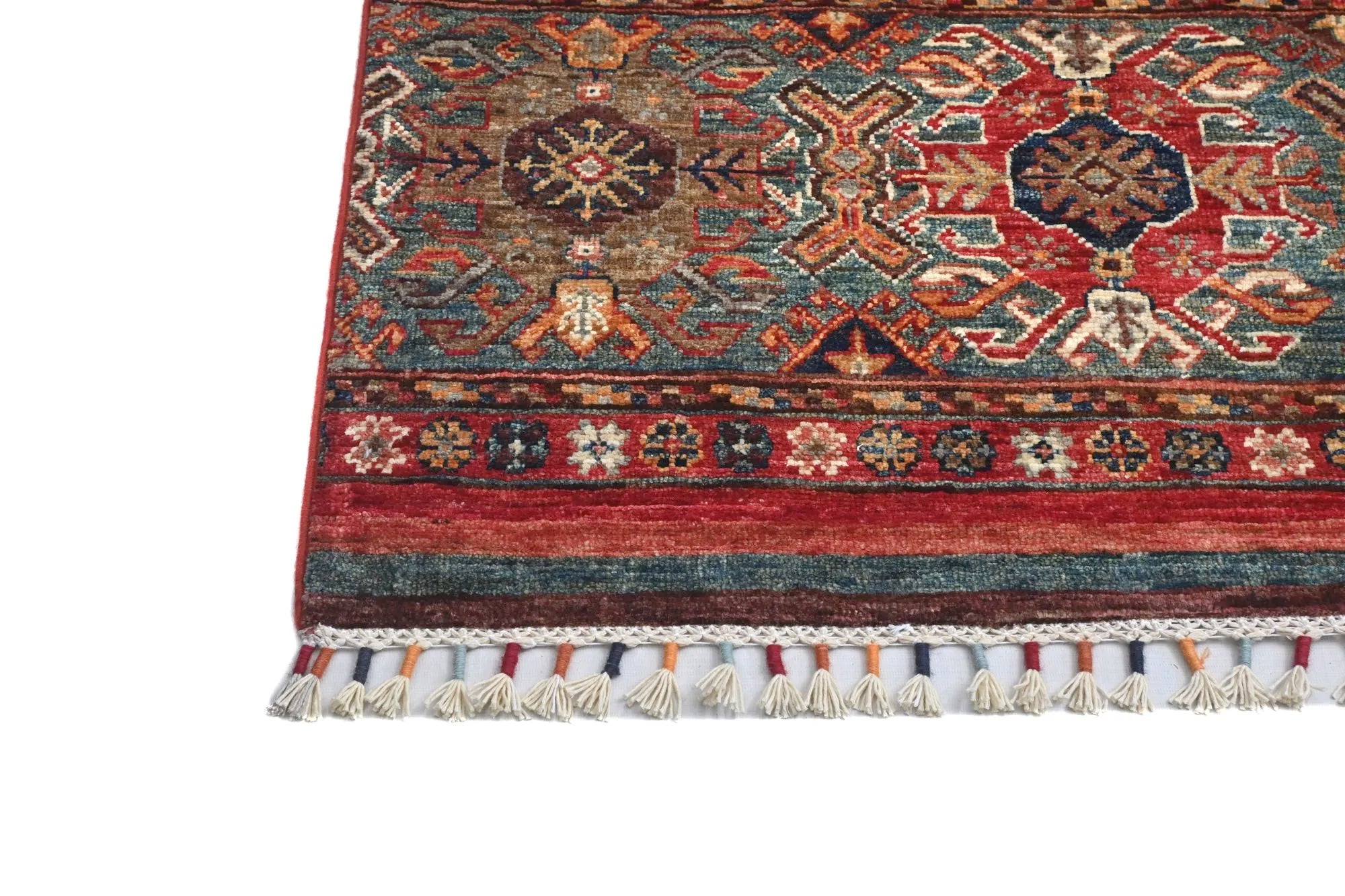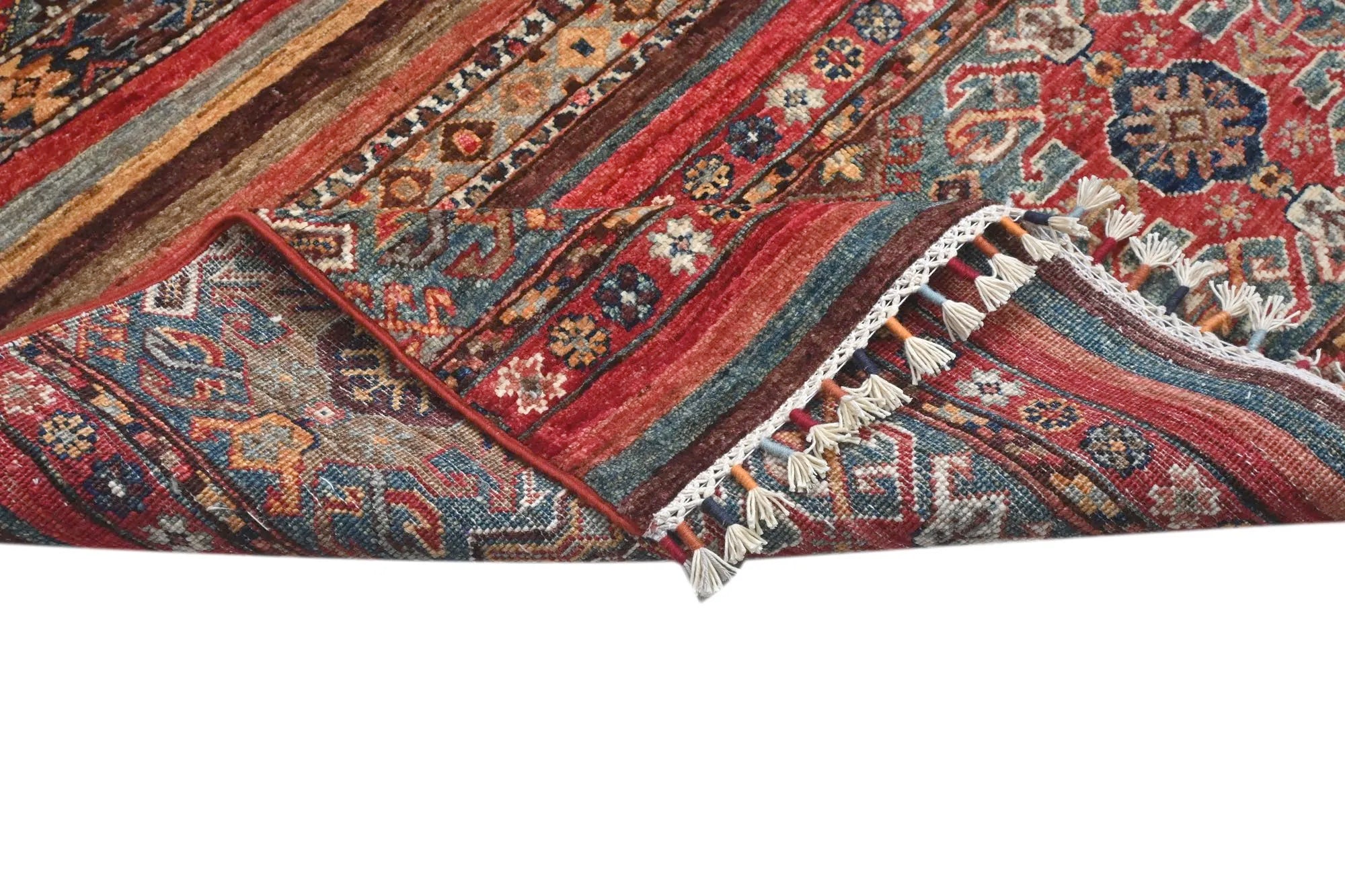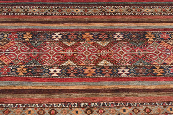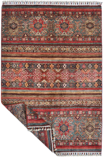 Khorjin rugs from Afghanistan are a type of traditional te x tile often used as bags or saddlebags by nomadic tribes in the region. These rugs are known for their practical uses and beautiful patterns. Originally created to be used as pack bags by nomadic people, Khorjin rugs are often designed with functionality in mind. The patterns on Khorjin rugs are often geometric and colorful, with symbolic motifs representing the tribe's culture and traditions. Common motifs include diamonds, rhombuses, and other geometric shapes, often in a rich color palette. Khorjin rugs are typically woven from wool, which makes them durable and tough enough for nomadic life. The colors in Khorjin rugs are usually natural, produced from plant dyes, giving them a warm and earthy color palette. Typical colors include red, blue, brown, and beige, but there may also be touches of green and yellow. Khorjin rugs are not just practical, but they are also artworks that tell stories about the tribe's life and culture. Each rug is unique and reflects the weaver's skill and creativity. High-quality materials and craftsmanship make Khorjin rugs long-lasting and valuable investments for customers.