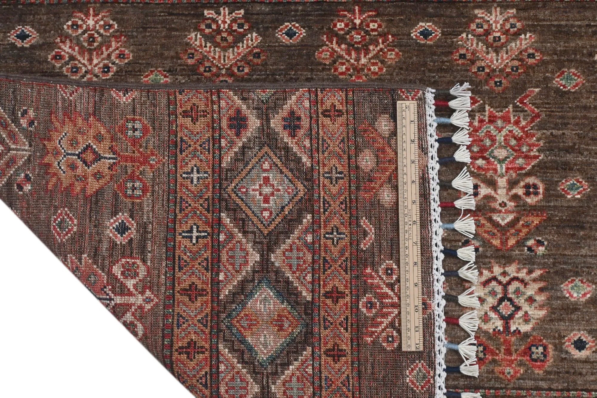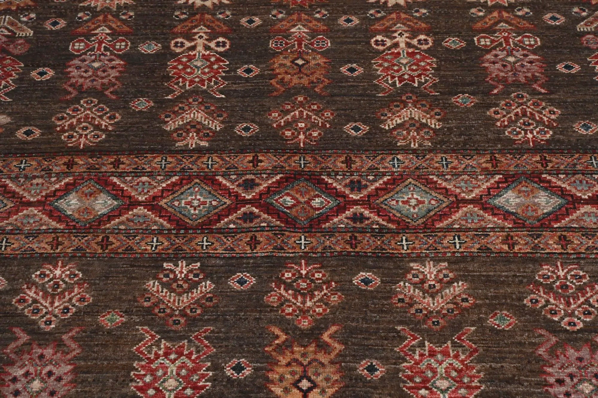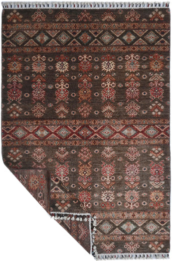 Khorjin rugs from Afghanistan are a type of traditional te x tile often used as bags or saddlebags by nomadic tribes in the region. These rugs are known for their practical uses and beautiful patterns. Originally created to be used as pack bags by nomadic people, Khorjin rugs are often designed with functionality in mind. The patterns on Khorjin rugs are often geometric and colorful, with symbolic motifs representing the tribe's culture and traditions. Common motifs include diamonds, rhombuses, and other geometric shapes, often in a rich color palette. Khorjin rugs are typically woven from wool, which makes them durable and tough enough for nomadic life. The colors in Khorjin rugs are usually natural, produced from plant dyes, giving them a warm and earthy color palette. Typical colors include red, blue, brown, and beige, but there may also be touches of green and yellow. Khorjin rugs are not just practical, but they are also artworks that tell stories about the tribe's life and culture. Each rug is unique and reflects the weaver's skill and creativity. High-quality materials and craftsmanship make Khorjin rugs long-lasting and valuable investments for customers.