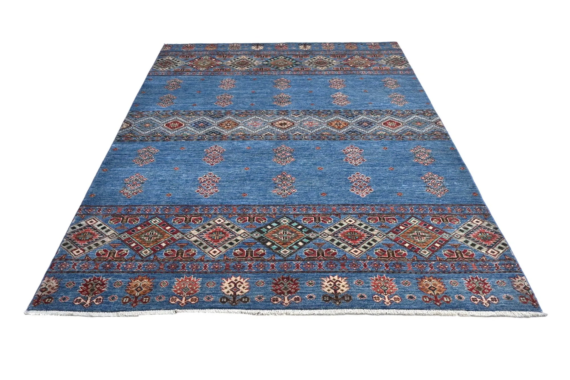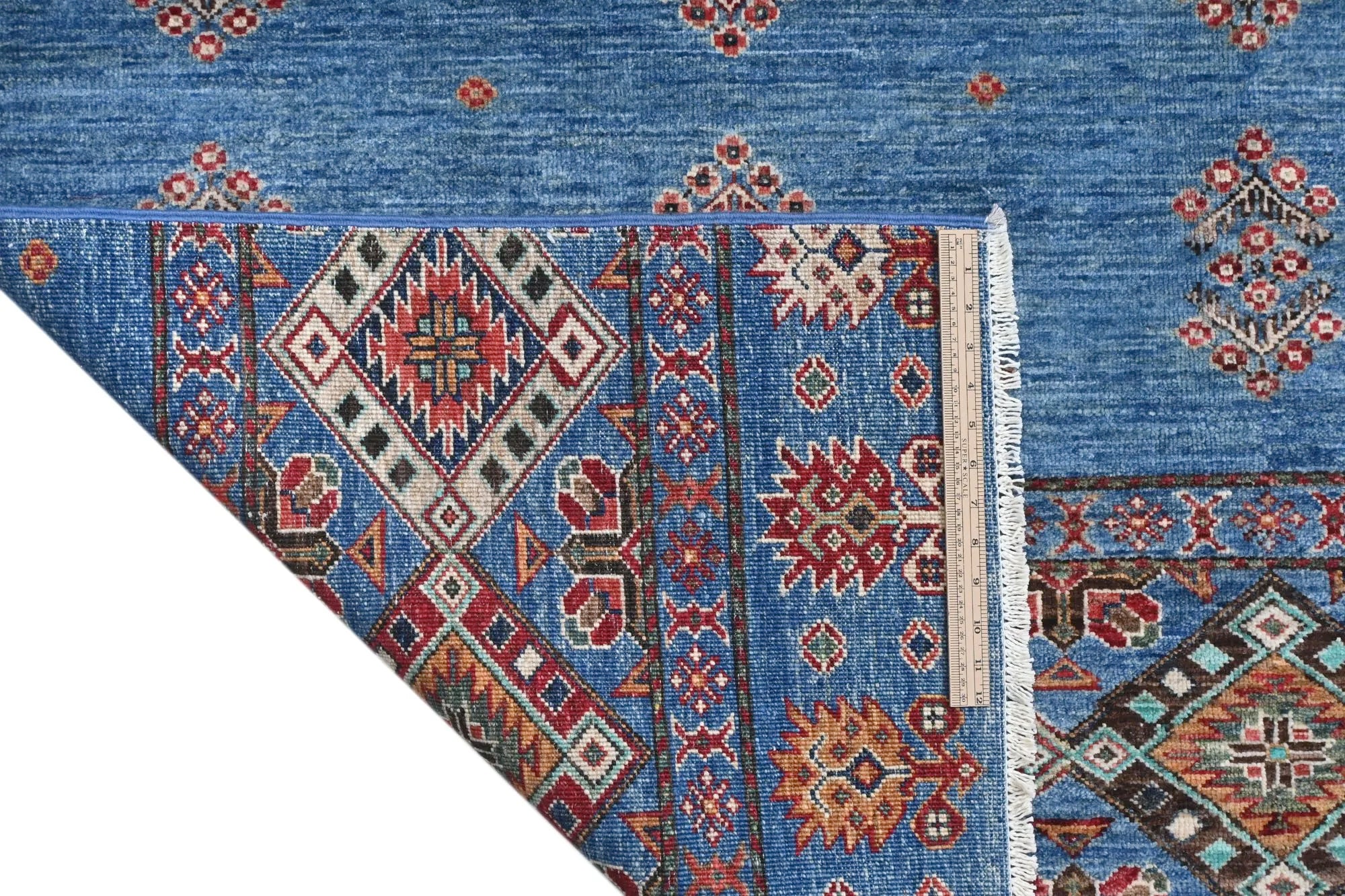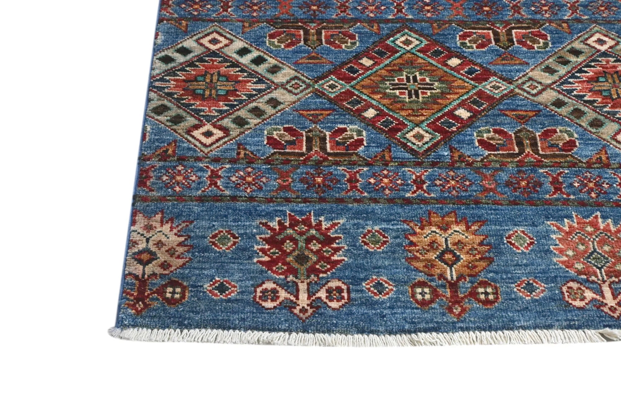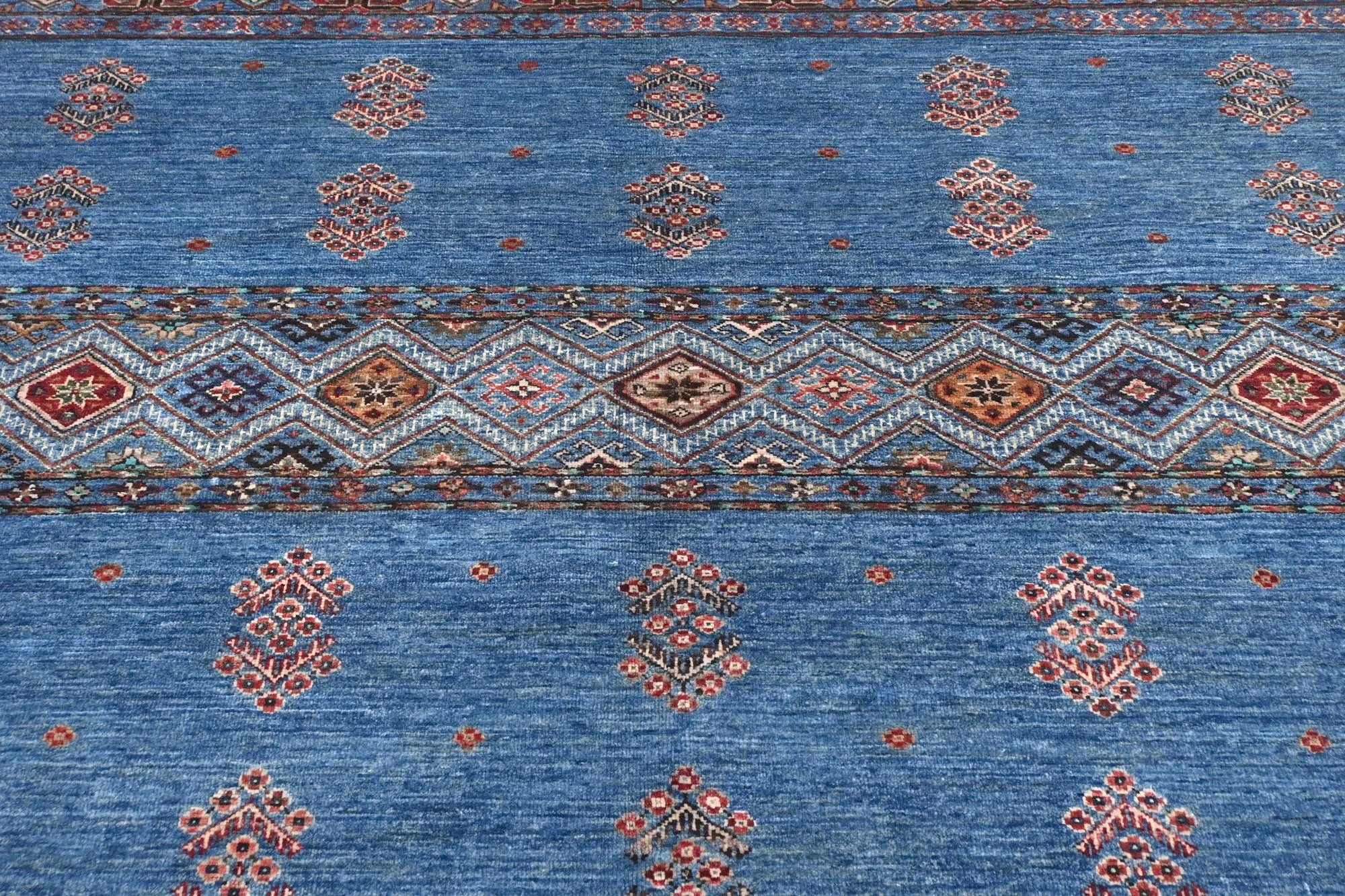 Khorjin rugs from Afghanistan are a type of traditional te x tile often used as bags or saddlebags by nomadic tribes in the region. These rugs are known for their practical uses and beautiful patterns. Originally created to be used as pack bags by nomadic people, Khorjin rugs are often designed with functionality in mind. The patterns on Khorjin rugs are often geometric and colorful, with symbolic motifs representing the tribe's culture and traditions. Common motifs include diamonds, rhombuses, and other geometric shapes, often in a rich color palette. Khorjin rugs are typically woven from wool, which makes them durable and tough enough for nomadic life. The colors in Khorjin rugs are usually natural, produced from plant dyes, giving them a warm and earthy color palette. Typical colors include red, blue, brown, and beige, but there may also be touches of green and yellow. Khorjin rugs are not just practical, but they are also artworks that tell stories about the tribe's life and culture. Each rug is unique and reflects the weaver's skill and creativity. High-quality materials and craftsmanship make Khorjin rugs long-lasting and valuable investments for customers.
