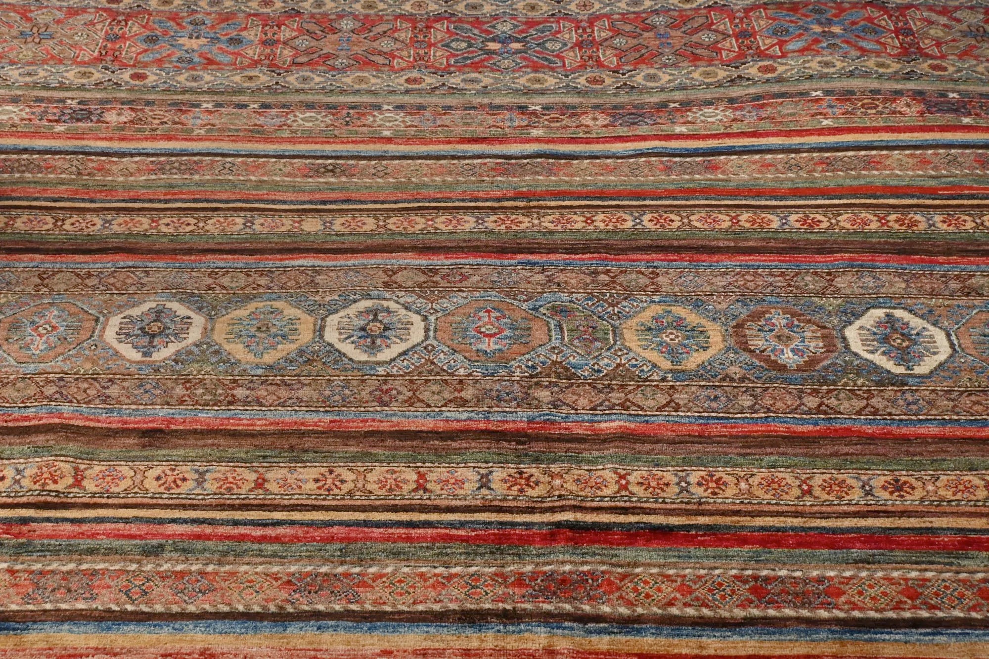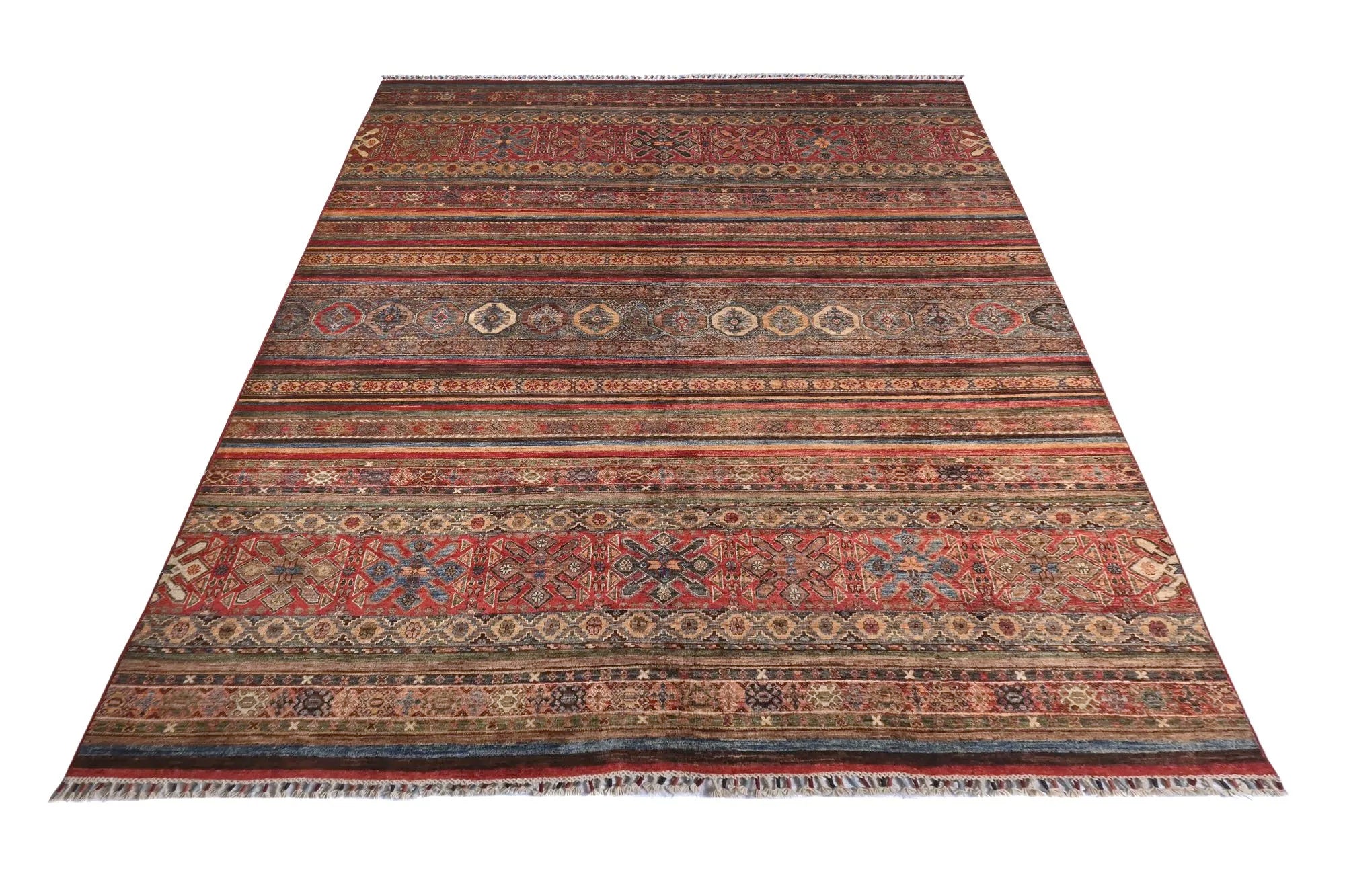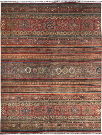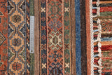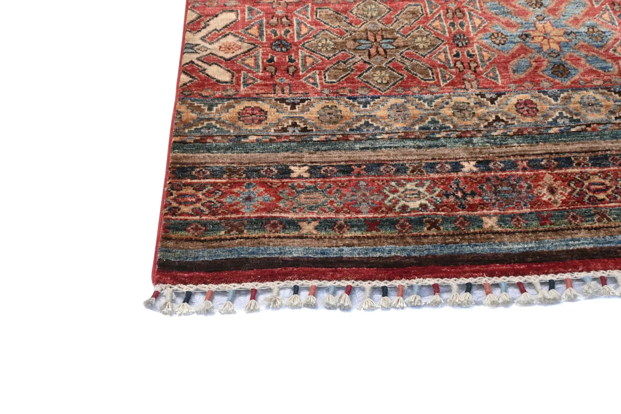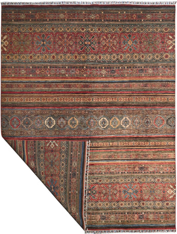 Khorjin rugs from Afghanistan are a type of traditional te x tile often used as bags or saddlebags by nomadic tribes in the region. These rugs are known for their practical uses and beautiful patterns. Originally created to be used as pack bags by nomadic people, Khorjin rugs are often designed with functionality in mind. The patterns on Khorjin rugs are often geometric and colorful, with symbolic motifs representing the tribe's culture and traditions. Common motifs include diamonds, rhombuses, and other geometric shapes, often in a rich color palette. Khorjin rugs are typically woven from wool, which makes them durable and tough enough for nomadic life. The colors in Khorjin rugs are usually natural, produced from plant dyes, giving them a warm and earthy color palette. Typical colors include red, blue, brown, and beige, but there may also be touches of green and yellow. Khorjin rugs are not just practical, but they are also artworks that tell stories about the tribe's life and culture. Each rug is unique and reflects the weaver's skill and creativity. High-quality materials and craftsmanship make Khorjin rugs long-lasting and valuable investments for customers.